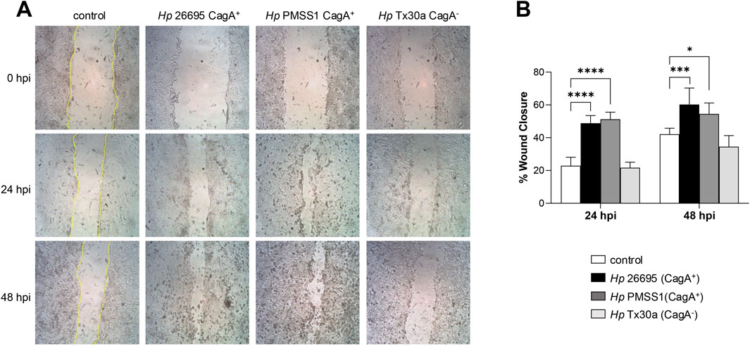 Figure 7. Migration of pancreatic cells infected with H. pylori. Confluent BxPC-3 cells were wounded using a pipette tip and then infected with Helicobacter pylori CagA+ and CagA− strains at an MOI of 100 for 48 h. (A) The wound closure area was measured at 24 and 48 hpi. The scratch area was drawn in yellow lines in the control cells. (B) The percentage of wound closure was statistically analyzed using Student’s t-test with a Bonferroni correction. Data are presented as mean ± SEM (n = 3). (*) p < 0.05; (***) p < 0.001; (****) p < 0.0001.