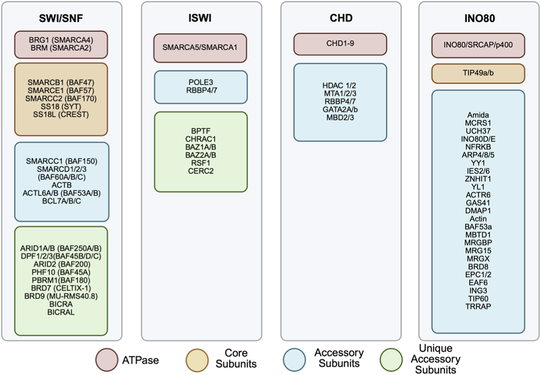 Subunits composition of chromatin remodeling complexes. The four chromatin remodeling complexes: SWI/SNF, ISWI, CHD and INO80, are represented with their respective subunits listed. Each family is made up of a selection of subunits including ATPase (red), core subunits (yellow), accessory subunits (blue) and unique accessory units (green). Different combinations of each subunit can result in differing complex actions. Several of these subunits have been implicated in cancer.