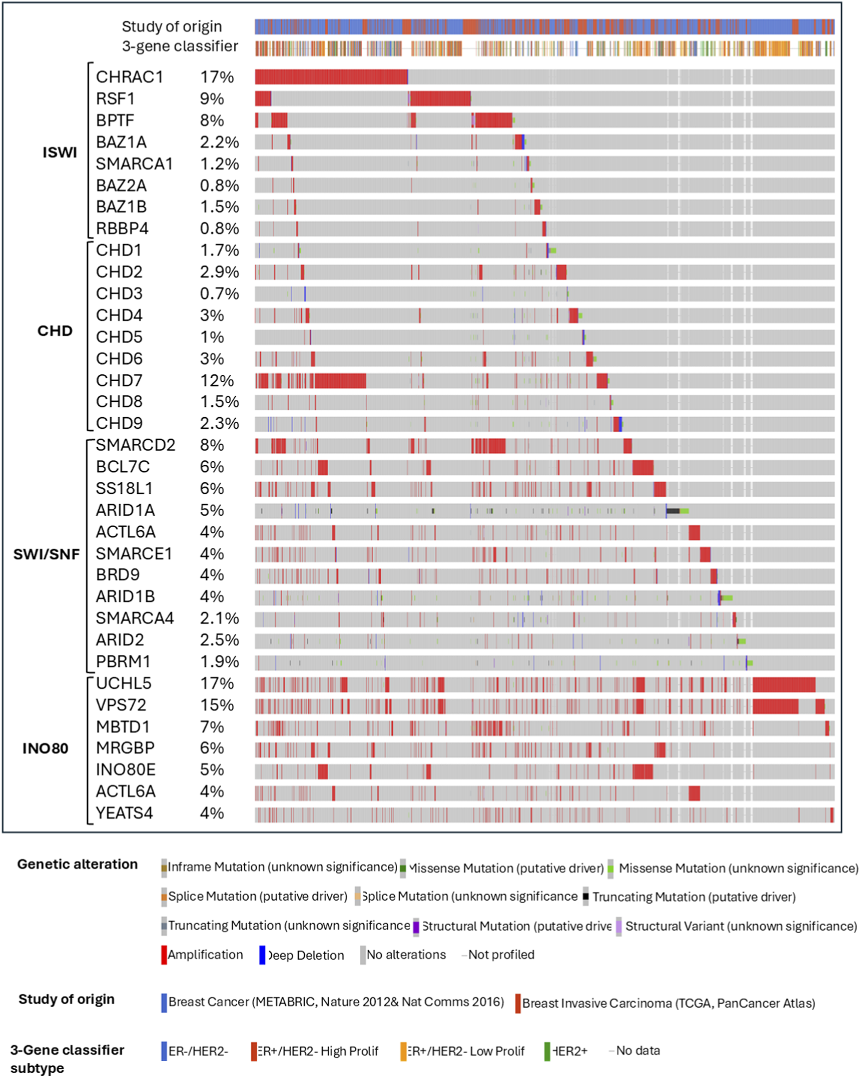 Summary plot of breast cancer study cohorts showing the most altered ISWI, CHD, SWI/SNF, and INO80 complex genes from the chromatin remodeling complexes in patients from METABRIC and TCGA invasive breast cancer studies from cBioPortal.