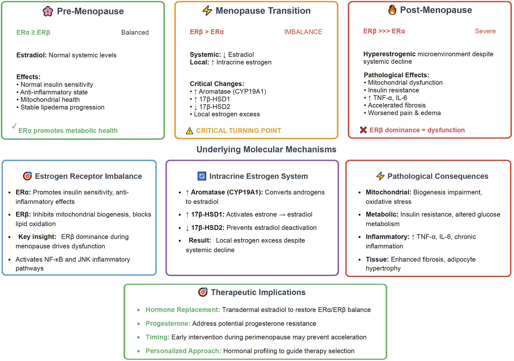 A groundbreaking 2025 model positions menopause as a critical turning point in lipedema progression, driven by estrogen receptor (ER) imbalance—predominance of ERβ over ERα—intracrine estrogen excess, and adipose tissue dysfunction (Pinto da Costa Viana et al., 2025). During menopause, systemic estradiol decline suppresses ERα signaling, which normally promotes insulin sensitivity and anti-inflammatory effects, while enhancing ERβ activity that inhibits mitochondrial biogenesis and lipid oxidation (Pinto da Costa Viana et al., 2025). This shift induces mitochondrial glitches, insulin resistance, and a pro-inflammatory milieu via NF-κB and JNK pathways, elevating cytokines like TNF-α and IL-6 (Pinto da Costa Viana et al., 2025). Temporal progression of this hormonal model, the transition from balanced ERα/ERβ signaling in pre-menopause through the critical turning point of menopause transition to the pathological ERβ dominance in post-menopause, along with the underlying molecular mechanisms and therapeutic implications is illustrated in Figure 2.