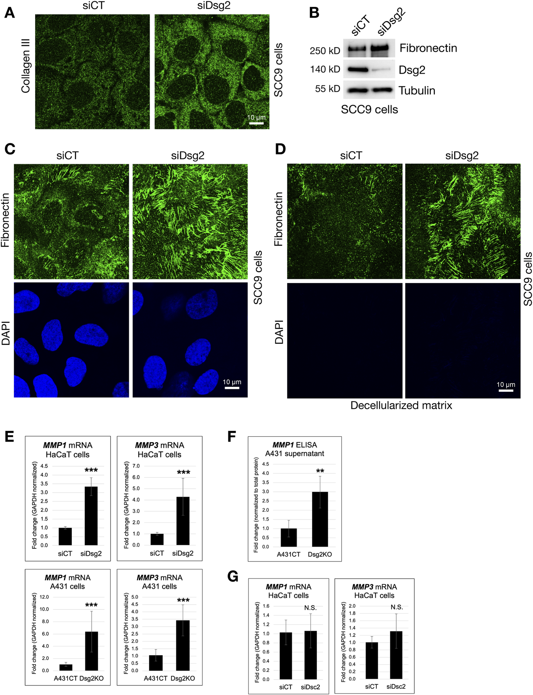 Dsg2-deficient cells have enhanced matrix deposition and matrix metalloproteinase expression. (A,C) SCC9 cells growing on coverslips were transfected with control siRNA (siCT) or siRNA specific for Desmoglein-2 (siDsg2). 72 h post transfection, cells were fixed, processed for immunofluorescence and stained with an anti-Collagen III (A) or anti-Fibronectin antibody (C). Coverslips were imaged with a Leica Microsystems TCS SP8 Spectral Confocal Microscope (scale bar = 10 μm). (B) siCT and siDsg2 expressing SCC9 cells were processed for SDS-PAGE and blotted for Fibronectin, Dsg2 and Tubulin (loading control). (D) siCT and siDsg2 expressing SCC9 samples were decellularized (as described in methods), and deposited matrix was fixed and stained with an anti-Fibronectin antibody. Decellularization was confirmed via loss of DAPI staining. (E) HaCaT cells were transfected with control siRNA (siCT) or siRNA specific for Desmoglein-2 (siDsg2). 72 h post transfection, total RNA was isolated from cell samples, followed by qPCR to analyze mRNA levels of Matrix Metallopeptidase 1 (MMP1) and Matrix Metallopeptidase 1 (MMP3). Identical experiments for MMP1 and MMP3 mRNA levels were performed in A431CT and Dsg2KO cells. All graphs shown represent fold change values of mRNA levels, with error bars indicating s.d. ( *** = p < 0.001). (F) MMP1 protein levels in cell culture supernatant from A431CT and Dsg2KO cells were analyzed via an ELISA assay. Graph shows fold change in MMP1 levels in A431 cell culture supernatant normalized to total cellular protein. (G) Total RNA was isolated from HaCaT cells transfected with siCT or siDsc2, followed by qPCR to analyze mRNA levels of MMP1 and MMP3. Graphs shown represent fold change values of mRNA levels, with error bars indicating s.d. (N.S. = not significant).