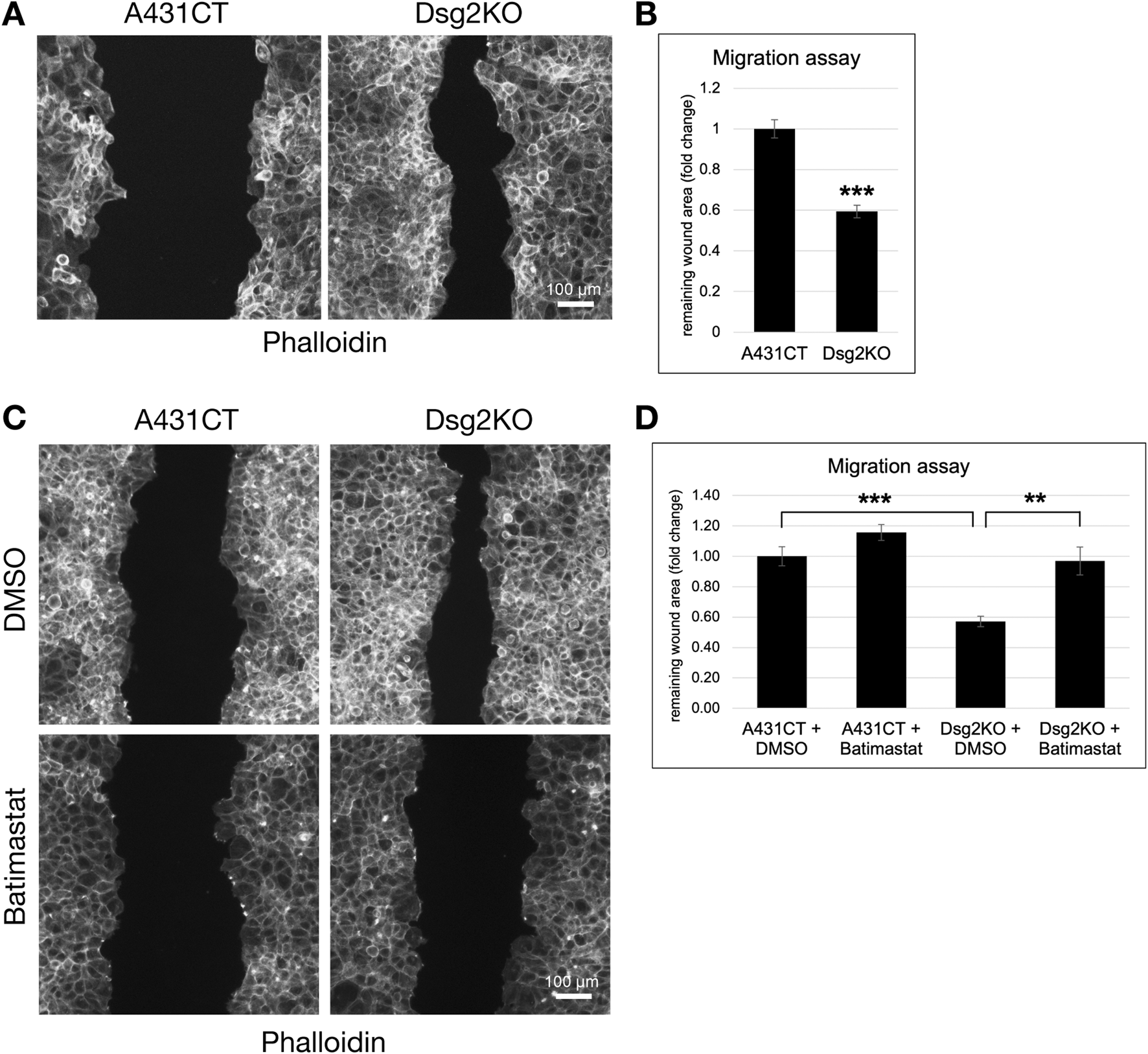 The enhanced migration of Dsg2-deficient keratinocytes is dependent on MMP activity. (A) Control A431 cells (A431CT) and Dsg2 knockout cells (Dsg2KO) were grown to confluency within culture inserts (Ibidi). 12–16 h after lifting the insert, cells were fixed and stained with AlexaFlour568-Phalloidin. Remaining wound area was captured with an EVOS M7000 inverted microscope and wound area quantified in FIJI (scale bar = 100 μm). (C) A431CT or Dsg2KO cells were grown to confluency within 2- or 3-well culture inserts (Ibidi). Following lifting of the culture insert, cells were treated with either DMSO (vehicle control) or Batimastat (1 µM). 12–16 h later, cells were fixed and with AlexaFlour568-Phalloidin. Remaining wound area was captured with an EVOS M7000 inverted microscope and wound area quantified in FIJI (scale bar = 100 μm). (B,D) Graphs shown represent fold change values of average remaining wound area (fold change), with error bars representing s.e.m. ( ** = p < 0.01, *** = p < 0.001). Note that a decrease in remaining wound area is indicative of an increase in rate of cell migration.