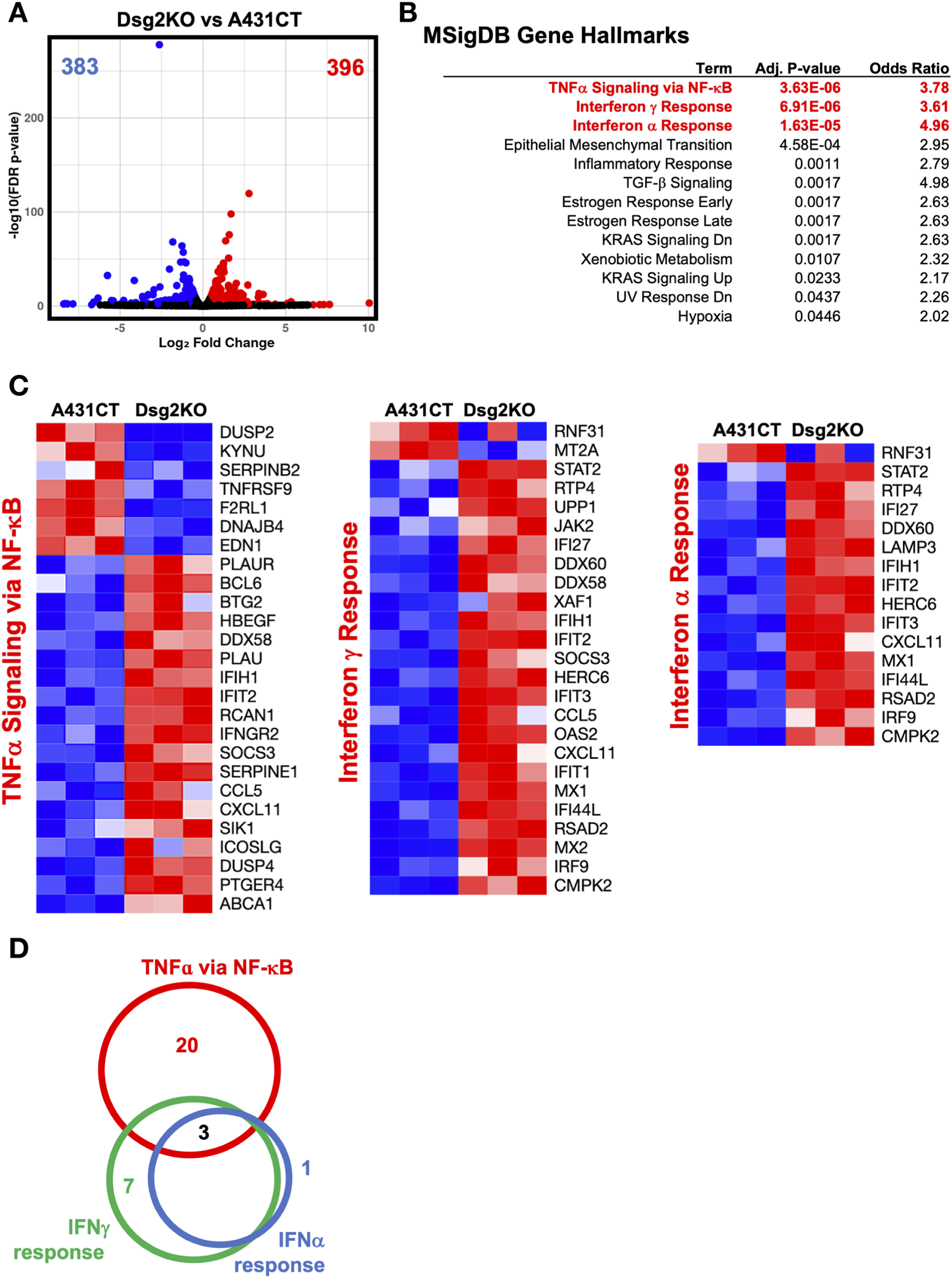 Loss of Dsg2 in keratinocytes causes an upregulation of inflammatory expression signatures. (A) Volcano plot showing differential gene expression between Dsg2KO and A431CT cells. Blue dots represent downregulated genes (n = 383), red dots represent upregulated genes (n = 396), gray dots represent non-significant genes. (B) Gene set enrichment analysis using MSigDB hallmark gene sets showing enriched pathways in Dsg2KO cells. (C) Heatmaps displaying expression patterns of genes from TNF-α signaling via NF-κB (left), Interferon γ Response (middle), and Interferon α Response (right) pathways. Red indicates upregulation, blue indicates downregulation. (D) Venn diagram illustrating gene overlap between the three major immune pathways, with three genes (IFIT2, IFIH1, CXCL11) common to all pathways. RNA sequencing performed with n = 3 biological replicates per condition; significance set at adjusted p-value <0.05.
