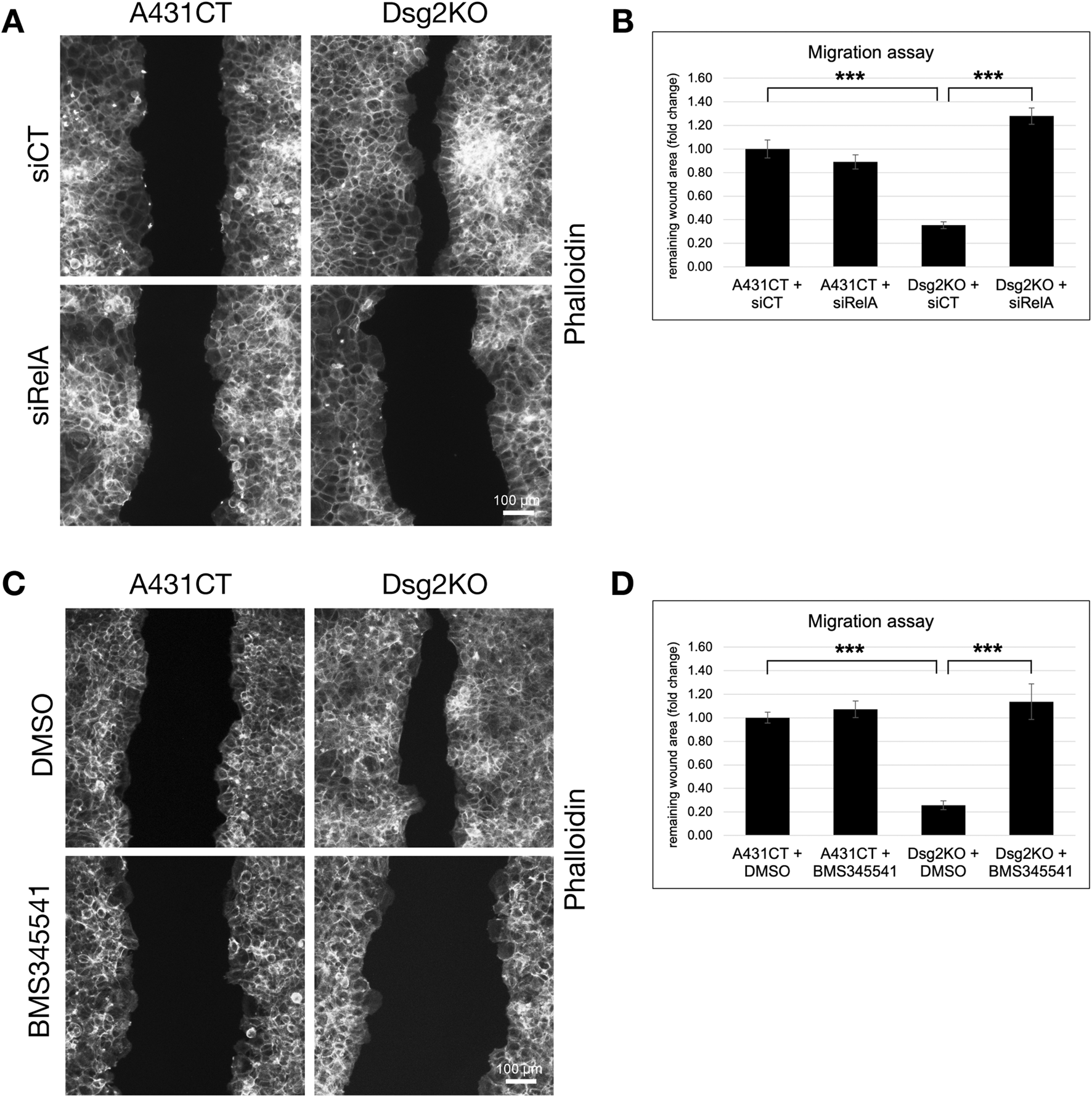 Inhibition of NF-κB signaling rescues Dsg2-mediated changes in cell migration. (A,B) A431CT and Dsg2KO cells were transfected with either siCT or siRelA and grown to confluency within culture inserts (Ibidi). 12–16 h after lifting the insert, cells were fixed and stained with AlexaFlour568-Phalloidin (scale bar = 100 μm). (C,D) A431CT and Dsg2KO cells were grown to confluency within culture inserts (Ibidi). Following lifting of the culture insert, cells were treated with either DMSO (vehicle control) or BMS345541 (1 µM). 12–16 h later, cells were fixed and with AlexaFlour568-Phalloidin. For all migration assays shown, remaining wound area was captured with an EVOS M7000 inverted microscope and wound area quantified in FIJI (scale bar = 100 μm). Graphs shown represent fold change values of average remaining wound area (fold change), with error bars representing s.e.m. ( *** = p < 0.001). Note that a decrease in remaining wound area is indicative of an increase in rate of cell migration.