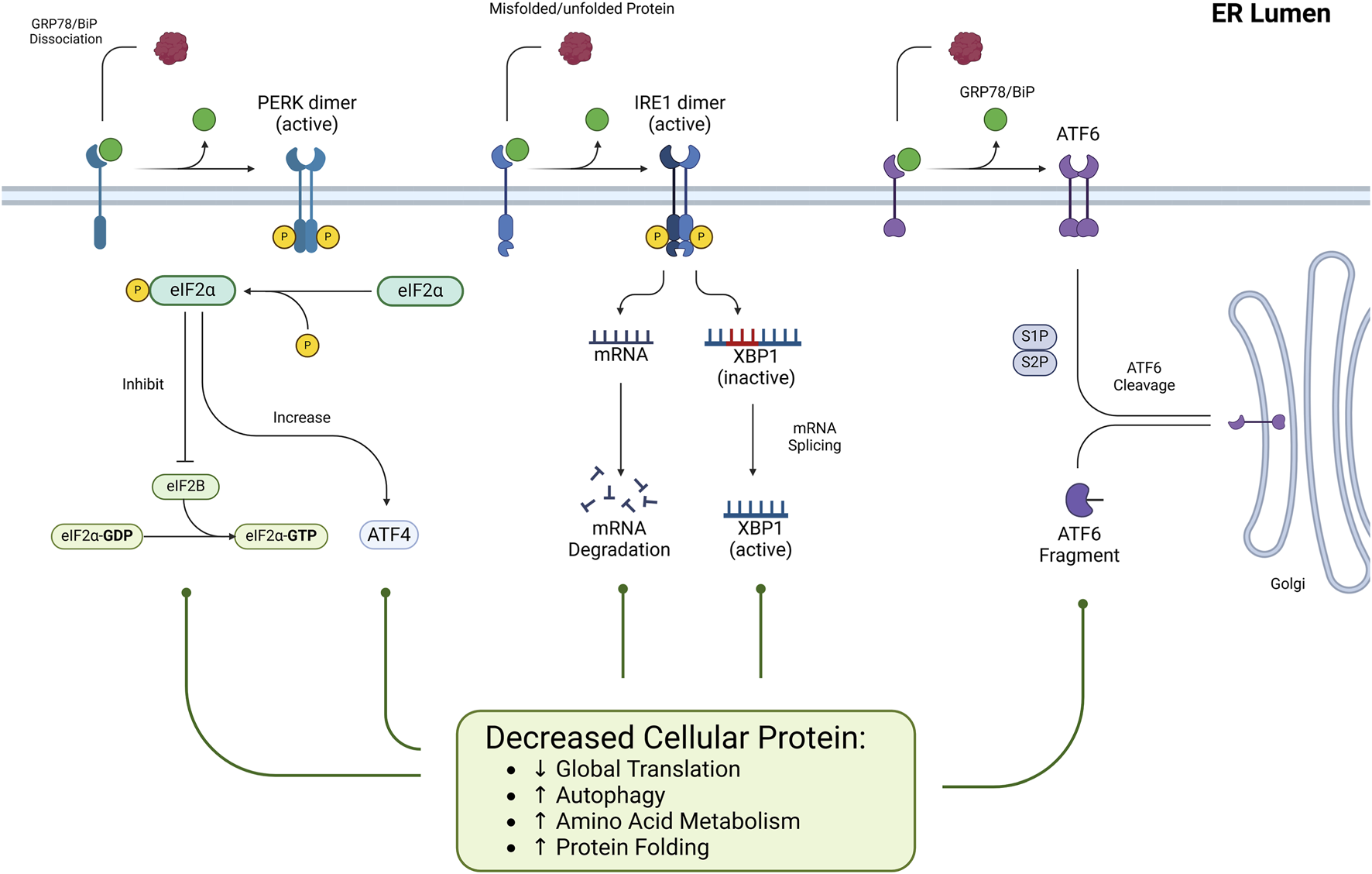 Phosphorylated eIF2α (p-eIF2α) inhibits the formation of the eIF2-GTP-tRNA complex, reducing overall global protein synthesis. p-eIF2α inhibits global protein synthesis by sequestering eIF2B, preventing eIF2-GDP from being reactivated to eIF2-GTP, and blocking the formation of the ternary complex needed for translation initiation (Bellato and Hajj, 2016). This reduction in translation is a protective strategy to lessen the influx of newly synthesized proteins into the already overloaded ER (Liu et al., 2024). This mechanism is not absolute and Activating Transcription Factor 4 (ATF4) mRNAs can bypass the global translation blockade. ATF4 then moves to the nucleus, activating genes related to amino acid metabolism, chaperone molecules, and autophagy (Yang et al., 2024).