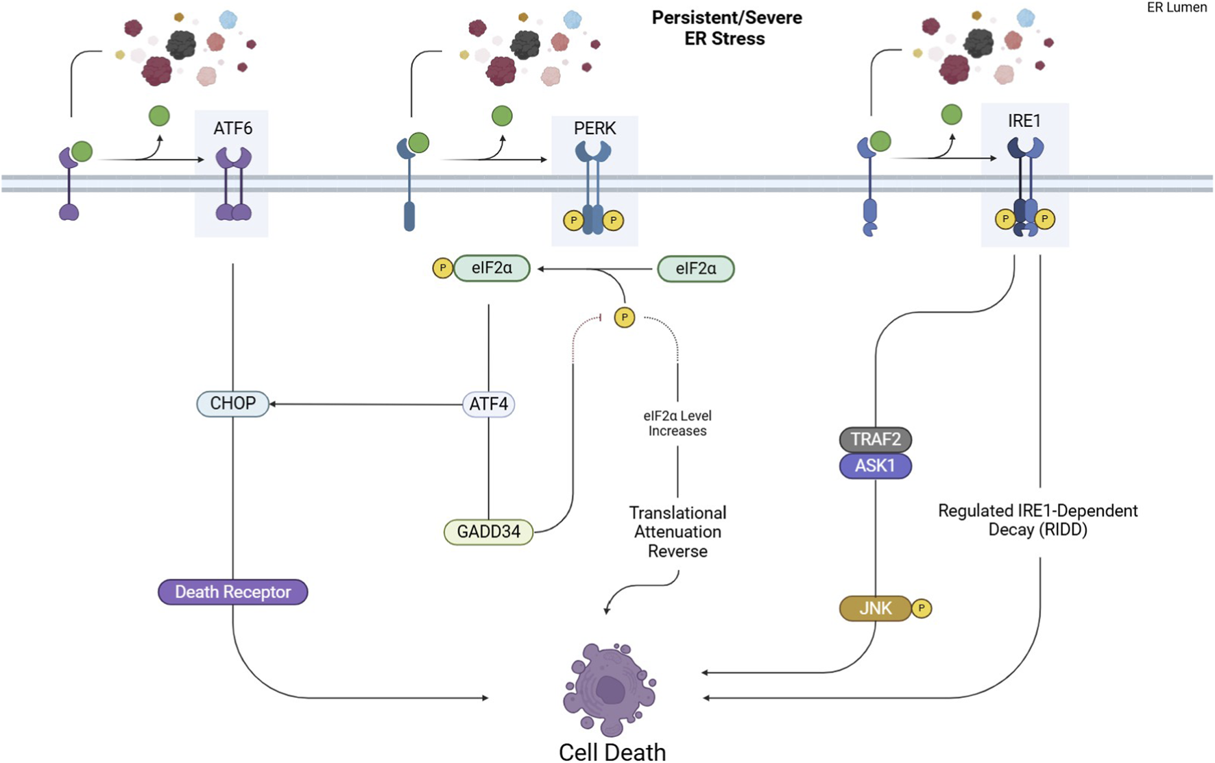 The UPR pathways play a dual role in regulating cell fate. Under mild or transient stress, it triggers adaptive processes that restore ER balance and support cell survival. However, when ER stress becomes excessive or persists beyond a critical threshold, the UPR transitions to a pro-apoptotic state (Chowdhury et al., 2024).