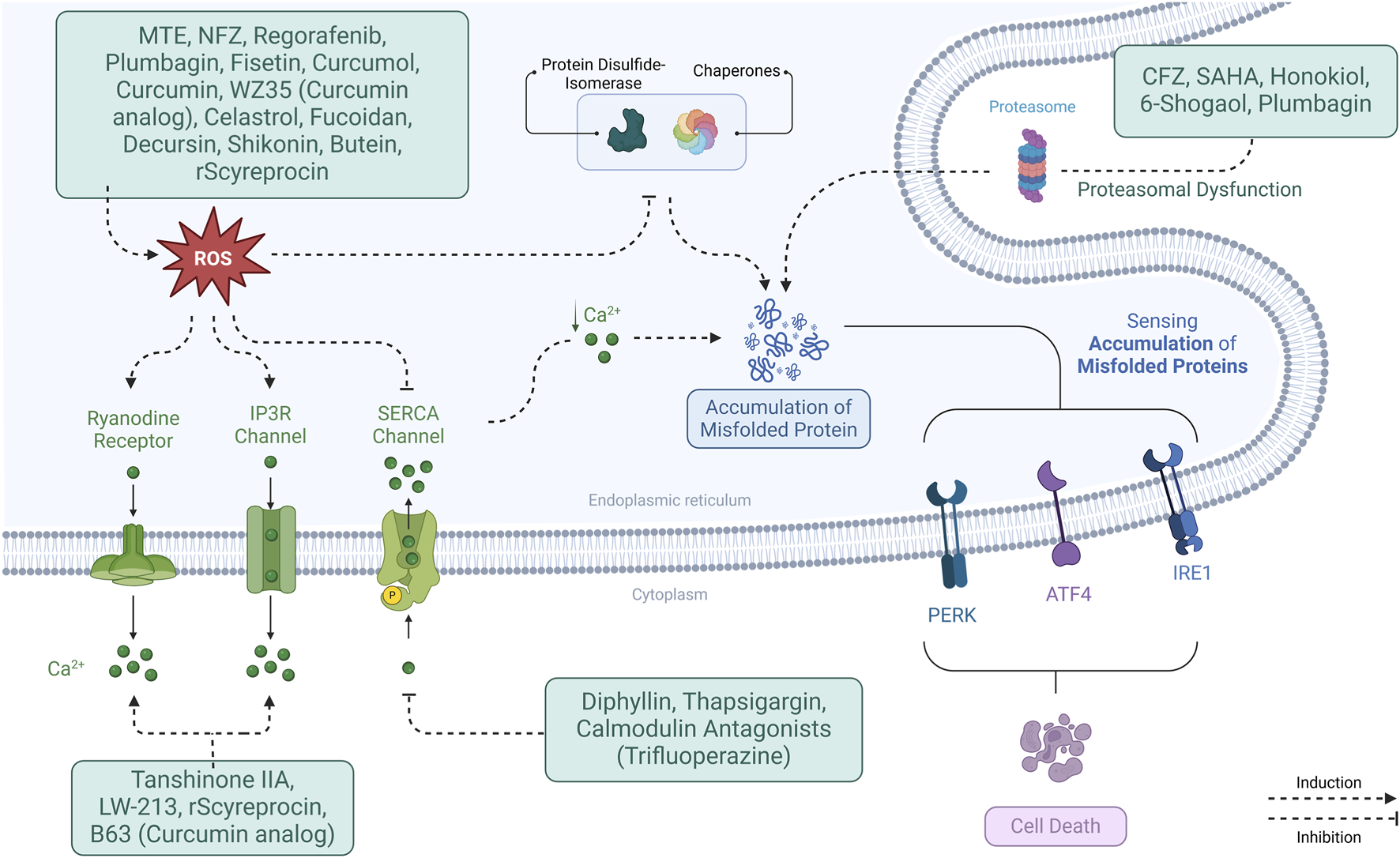 Nifuroxazide (Li et al., 2023) and Plumbagin (Jiang et al., 2021) both increase ROS levels, leading to elevated intracellular Ca2+ and the activation of ER stress pathways. Similarly, Tanshinone IIA elevates Ca2+ levels, activating ER stress and JNK signaling while downregulating NFAT2 and c-Myc, which are associated with cellular survival (Zhang YZ. et al., 2024). LW-213, a derivative of Wogonin, inhibits NPC1, leading to cholesterol depletion in the ER. This triggers Ca2+ release and activation of FAM134B, promoting Reticulophagy, ER stress, and apoptosis (Wang H. et al., 2024). Recombinant scyreprocin (rScyreprocin) also increases ROS levels, which can lead to ER stress, Ca2+ release, mitochondrial dysfunction, and apoptosis (Yang et al., 2022).