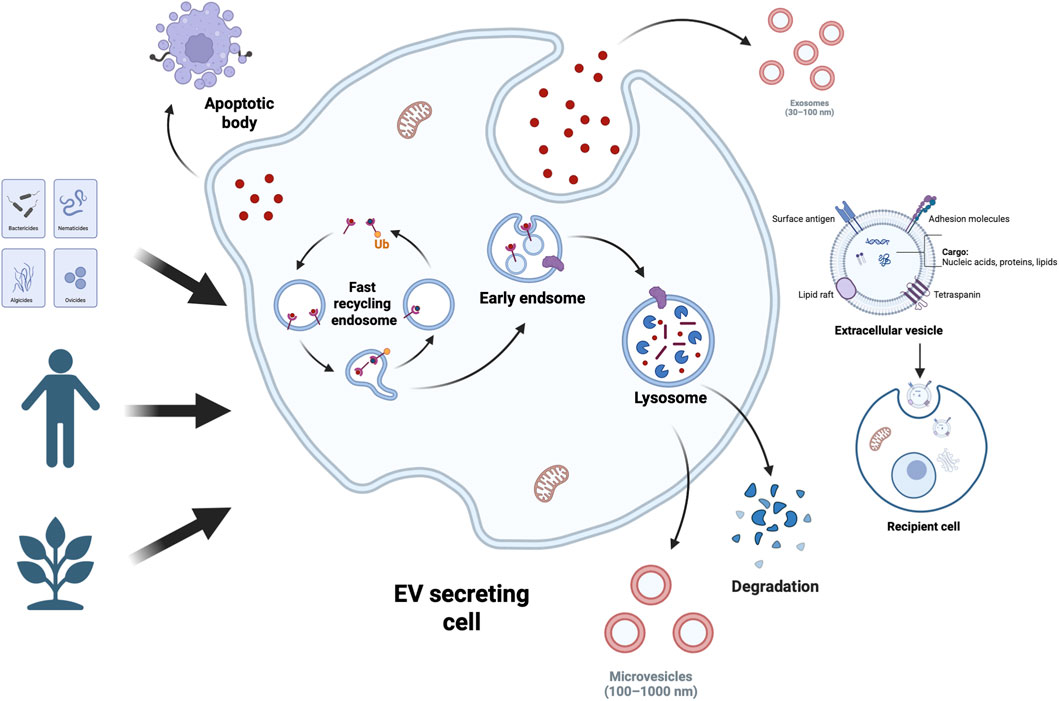 Figure 1. EV Types and Sources. Extracellular vesicles (EVs) encapsulate bioactive components like proteins, nucleic acids, and lipids—lipids act as structural elements and reflect cellular traits. Cells across tissues use EVs for intercellular communication, releasing them into body fluids. A large share of human EVs comes from stem cells; EVs are also actively produced and released by organisms from plants to bacteria.