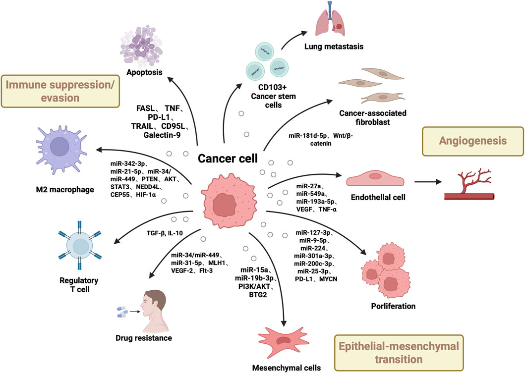 EVs-miRNA, as key information molecules secreted by tumour cells and released into body fluids, participate in regulating multiple tumour biological processes, particularly in remodelling the tumour microenvironment (TME) (D'Souza-Schorey and Clancy, 2012). EVs modulate the state of local fibroblasts, macrophages, and vascular endothelial cells, inducing their transformation into pro-tumour subtypes that support tumour progression (Kosaka et al., 2016; Madeo et al., 2018; Ringuette Goulet et al., 2018). Furthermore, tumour derived EVs exert remote effects, inducing the formation of ‘pre-metastatic niches’ in target organs, enhancing vascular permeability, recruiting mesenchymal stem cells, and reprogramming the local matrix (Hoshino et al., 2015; Zhang L. et al., 2015). Conversely, EVs released by stromal cells can influence tumour cell behaviour, either enhancing their invasive capacity or inducing a dormant state (Roccaro et al., 2013; Ono et al., 2014). EVs also transmit drug resistance signals between primary and metastatic sites, participating in the establishment and maintenance of resistance (Qu et al., 2016; Lobb et al., 2017).