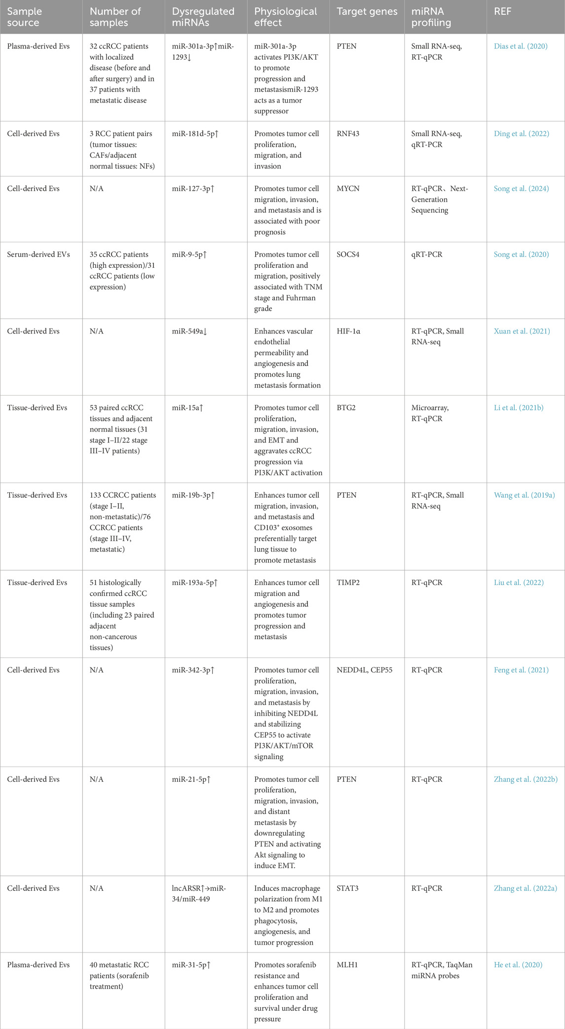 In recent years, multiple studies have progressively revealed the pivotal regulatory role of miRNAs carried by EVs in the development and progression of clear cell renal cell carcinoma (ccRCC). DISA et al. discovered that PTEN serves as a common target gene for hsa-miR-301a-3p, hsa-miR-200c-3p, and hsa-miR-25-3p. Studies indicate that these miRNAs are significantly enriched in plasma extracellular vesicles during the presence of primary tumours, with their expression levels markedly decreasing following tumour resection. This suggests that EVs-miRNAs may regulate tumour progression at the post-transcriptional level by activating the PI3K/AKT signalling pathway (Dias et al., 2020). Notably, hsa-mir-301a-3p exhibited a declining trend post-tumour resection, with its levels continuing to decrease during follow-up. However, its expression significantly increased in the metastasis cohort, suggesting this miRNA may play a crucial role in metastasis and holds potential as a prognostic biomarker. In contrast, the EV-derived levels of hsa-miR-1293 progressively increased after tumour resection until follow-up yet were markedly reduced in the metastatic cohort. This indicates the miRNA’s potential tumour-suppressing function and its possibility as a biomarker for metastatic disease in ccRCC patients (Dias et al., 2020). Among these, hsa-miR-301a-3p exhibited a consistent decrease in expression following surgery but was significantly elevated in patients with metastasis during follow-up, indicating its potential involvement in metastatic dissemination and its utility as a prognostic biomarker. Conversely, hsa-miR-1293 displayed increased EV expression post-surgery but was significantly downregulated in metastatic cases, suggesting its potential tumor-suppressive role and prognostic relevance in identifying metastatic ccRCC (Dias et al., 2020). Ding et al. using small RNA sequencing, demonstrated that miR-181d-5p was highly enriched in EVs derived from cancer-associated fibroblasts (CAFs) in RCC patients. This miRNA directly suppressed RNF43 expression in RCC cells and activated the Wnt/β-catenin pathway, thereby enhancing cancer stemness and promoting tumor progression (Ding et al., 2022). Additionally, RAB27 A/B has been shown to regulate EV-miRNA secretion. Decreased RAB27A expression was closely associated with lymph node metastasis and poor prognosis in RCC (Chen et al., 2012; An et al., 2019). Song et al. further reported that elevated RAB27A expression promoted RCC cell secretion of miR-127-3p, which, through EV-mediated transfer, upregulated MYCN expression and enhanced tumor invasiveness (Song et al., 2024). miR-9-5p has also been implicated in RCC progression. Song et al. found that it was significantly elevated in serum from advanced RCC patients and positively correlated with TNM stage and Fuhrman grade. Functional assays demonstrated that EV-derived miR-9-5p promoted proliferation and invasion of A-704 cells by downregulating SOCS4, both in vitro and in vivo, supporting its role as a diagnostic and prognostic biomarker (Song et al., 2020).