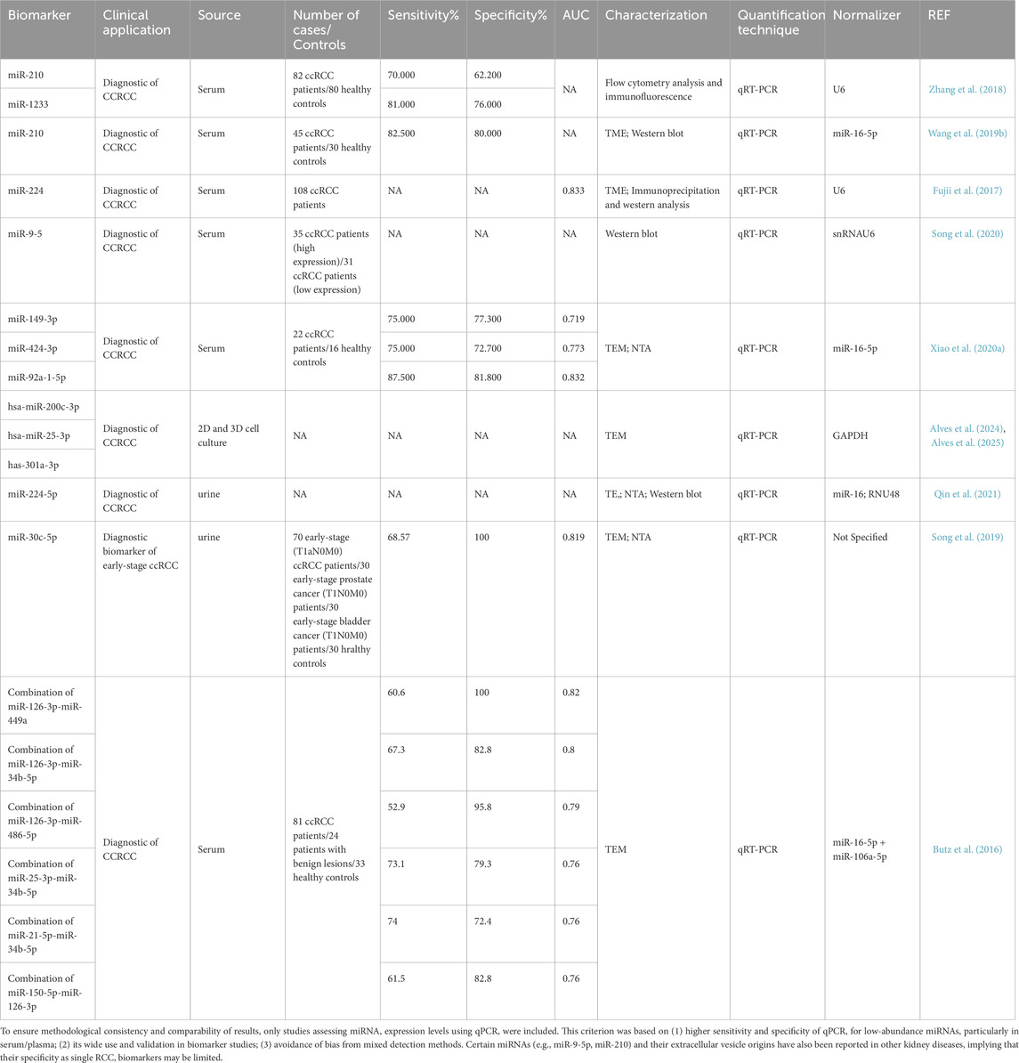 miR-210 and miR-1233, isolated from serum extracellular vesicles, have been validated as diagnostic biomarkers for clear cell renal cell carcinoma (ccRCC), exhibiting sensitivities of 70% and 81%, respectively, alongside specificities of 62.2% and 76.0%. Notably, these biomarkers demonstrate a significant decline following nephrectomy. Furthermore, Wang and colleagues reported that miR-210 could identify RCC with 82.5% sensitivity and 80.0% specificity. In this context, higher miR-210 levels were observed in more advanced cases and those with higher Fuhrman grading, independent of gender or age (Zhang et al., 2018; Wang X. et al., 2019). Fujii et al. further demonstrated that high expression of Exo-miR-224 correlates strongly with poor prognosis in ccRCC patients, manifesting as reduced survival times and accelerated tumour progression. Compared to the low-expression group, the high-expression Exo-miR-224 group exhibited significantly shorter progression-free survival, cancer-specific survival, and overall survival. In multivariate analysis, elevated Exo-miR-224 levels emerged as a significant prognostic risk factor across all studies. Co-incubation of primary renal cell carcinoma (RCC) cell lines with extracellular vesicles derived from metastatic RCC cell lines enhanced cellular proliferation and invasive capacity while markedly reducing apoptotic cell proportions. Intracellular miR-224 levels were significantly upregulated in primary renal carcinoma cell lines. Extracellular miR-224 in extracellular vesicles influences patient prognosis and represents a potential prognostic biomarker in ccRCC patients (Fujii et al., 2017). Dias et al. confirmed that multiple miRNAs (miR-301a-3p, miR-200c-3p, miR-25-3p) play a crucial role in sustaining ccRCC cell proliferation by targeting PTEN and activating the PI3K/AKT pathway. The expression level of hsa-miR-301a-3p derived from EVS was again elevated in metastatic patients, highlighting its potential as a biomarker for metastatic disease (Dias et al., 2020; Alves et al., 2024). Findings by Alves et al. further support hsa-miR-200c-3p, hsa-miR-25-3p, and hsa-miR-301a-3p in extracellular vesicles as potential biomarkers for monitoring disease aggressiveness. Experiments revealed that co-inhibiting these EVs-miRNAs significantly increased PTEN expression, reduced tumour cell proliferation and migration in 2D models, and diminished spheroid size and metabolic capacity in 3D models. These EVs-miRNAs demonstrate potential as biomarkers for monitoring disease invasiveness and as therapeutic targets for ccRCC, potentially enabling more effective and personalised treatments for patients (Alves et al., 2025). Song et al. identified miR-9-5 as highly expressed in renal cancer patients’ serum, correlating with advanced TNM staging (tumour size, lymph node metastasis) and Fuhrman grade. Both in vitro and in vivo studies suggest its utility as a diagnostic biomarker and treatment response monitor (Song et al., 2020). Furthermore, Xiao et al. reported upregulation of miR-149-3p and miR-424-3p alongside significant downregulation of miR-92a-1-5p in plasma EVs, suggesting their combination holds potential for RCC screening. Plasma extracellular vesicles containing hsa-miR-92a-1-5p,hsa-miR-149-3p, and hsa-miR-424-3p in plasma extracellular vesicles may serve as potential biomarkers for detecting RCC (Xiao C. T. et al., 2020).