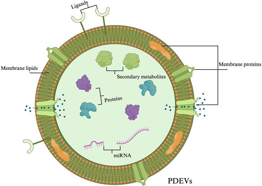 Figure 1. Schematic representation of key components commonly found in plant-derived extracellular vesicles (PDEVs). These include membrane lipids, ligands, secondary metabolites, proteins, microRNAs (miRNAs), and membrane proteins, which collectively contribute to the vesicles’ biological functions and potential applications.