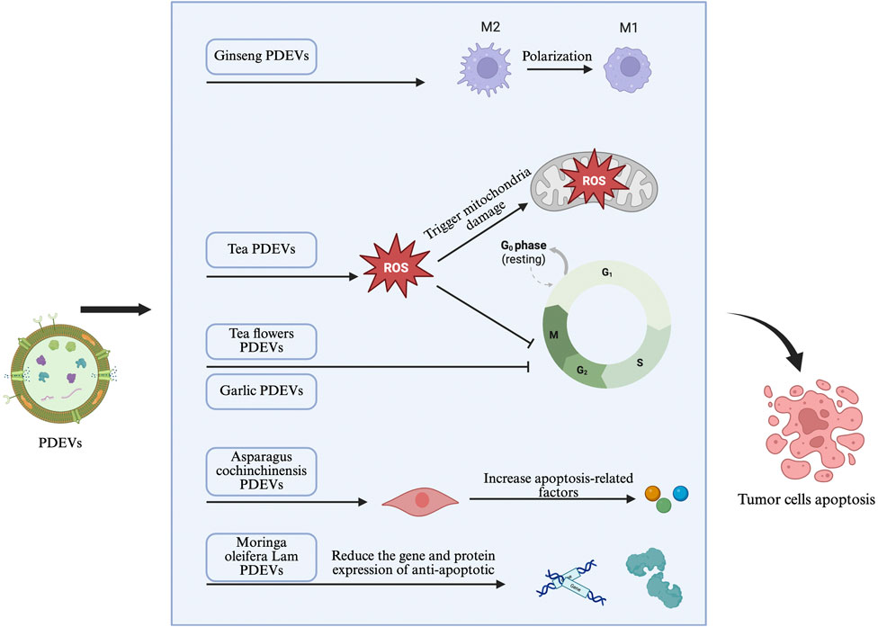 The tumor microenvironment (TME) is markedly different from the normal physiological environment and is a prerequisite for supporting tumor cell proliferation and metastasis. An inflammatory microenvironment significantly promotes cancer proliferation, metastasis, and drug resistance. A relatively hypoxic environment promotes angiogenesis, providing sustained nutrient supply for cancer cell growth. Tumor-associated macrophages (TAMs) are a major component of the TME (Noy and Pollard, 2014). Studies show that TAM infiltration in tumor tissue supports tumor growth, angiogenesis, invasion, and metastasis, and is positively correlated with tumor progression and drug resistance (Mantovani et al., 2002). Generally, TAMs have considerable plasticity and exhibit opposite phenotypes and functions, including tumor-killing M1 macrophages and tumor-supporting M2 macrophages. In most tumor types, M2-like phenotype macrophages dominate. Clearing M2-like macrophages and tilting macrophages towards the M1-like phenotype has become an attractive strategy in cancer therapy (Biswas and Mantovani, 2010). In fact, PDEVs can inhibit cancer progression through the above processes, emphasizing their ability to manipulate the cellular microenvironment towards a state that suppresses tumor cell growth (NCT01294072 and NCT01668849). Studies found that ginseng-derived PDEVs could inhibit M2-like polarization of macrophages and promote M1 macrophage expression in the TME through a mechanism dependent on the Toll-like receptor (TLR)-4/myeloid differentiation primary response 88 (MyD88) signaling pathway. In vivo experiments showed significant inhibition of certain tumor growth in mice treated with ginseng-derived PDEVs (Cao et al., 2019). Besides ginseng, PDEVs extracted from carrots, apples, broccoli, ginger, grapes, grapefruit, and cabbage have also been developed and evaluated for their anticancer properties (Raimondo et al., 2015; Mu et al., 2014). It is reported that these PDEVs can reduce cancer growth by modulating macrophage polarization and TAMs (Noy and Pollard, 2014; Biswas and Mantovani, 2010). Over the past decade, immune checkpoint inhibitors have gained attention in cancer therapy for their ability to promote cytotoxic T cell activity to kill cancer cells. However, due to insufficient T cell infiltration, immune checkpoint inhibitors are ineffective for some solid tumors, which are called cold tumors. Interestingly, some plant-derived PDEVs can enhance the anticancer effects of immune checkpoint antibodies by reprogramming the cold tumor microenvironment. This ability to “heat up” the “cold” tumor environment by reprogramming TAMs has prompted attempts to synergize PDEVs with immune checkpoint inhibitors, opening a new avenue for the treatment of solid tumors (Zhao et al., 2023). Additionally, due to active cancer cell metabolism, they are usually more susceptible to oxidative stress than normal cells, and increased ROS content in the cellular microenvironment can indirectly elevate intracellular ROS levels, triggering mitochondrial damage and blocking the cell cycle, thereby inhibiting cancer cell proliferation and migration. Inducing a large amount of ROS in the tumor environment can also induce cancer cell death, while most normal cells are spared. It is reported that edible tea flower-derived PDEVs can inhibit cancer development by producing excessive ROS with basically no effect on normal cells (Zhao et al., 2023). Moreover, high ROS can also increase the susceptibility of drug-resistant cancer cells. For example, bitter melon-derived PDEVs increased the chemosensitivity of squamous cell carcinoma cells to 5-fluorouracil (Zhao et al., 2023). In summary, most PDEVs can interfere with tumor progression by affecting the TME of cancer cells. However, certain TMEs also pose challenges for the application of PDEVs. For example, an acidic TME may cause premature degradation of PDEVs, and a high-immunity-status TME may interfere with PDEV surface proteins, preventing targeted fusion with tumor cells. Developing nanomedicine-modified delivery systems and strengthening the surface resistance of PDEVs may help solve these problems.