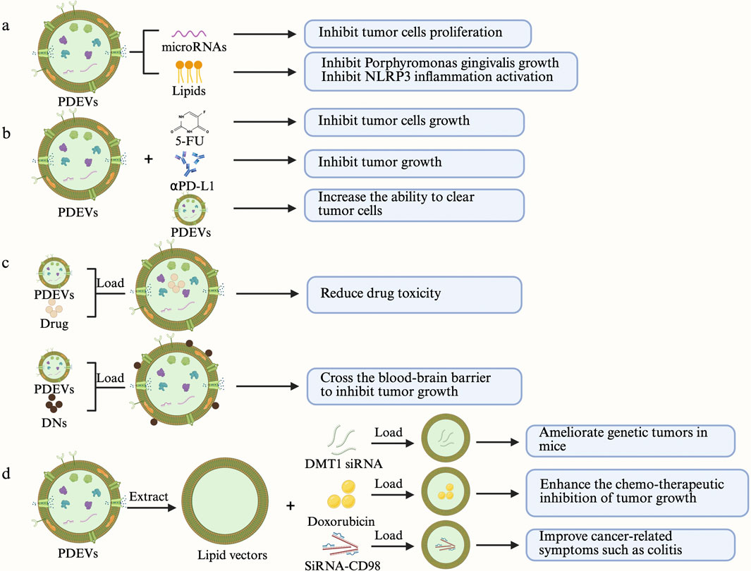 Figure 3. PDEVs as potential adjuvants for anti-genitourinary tumor therapy. (a) PDEVs serve as drugs to treat tumors. (b) PDEVs are synergistically used with other drugs to treat tumors. (c) Isolated PDEVs are directly loaded with drugs to treat tumors. (d) Extracted and reassembled PDEVs are loaded with drugs to treat tumors.
