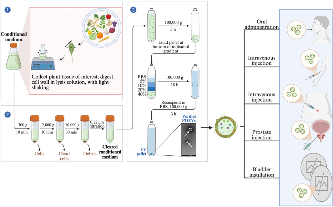 Potential administration routes of plant-derived extracellular vesicles in genitourinary tumors