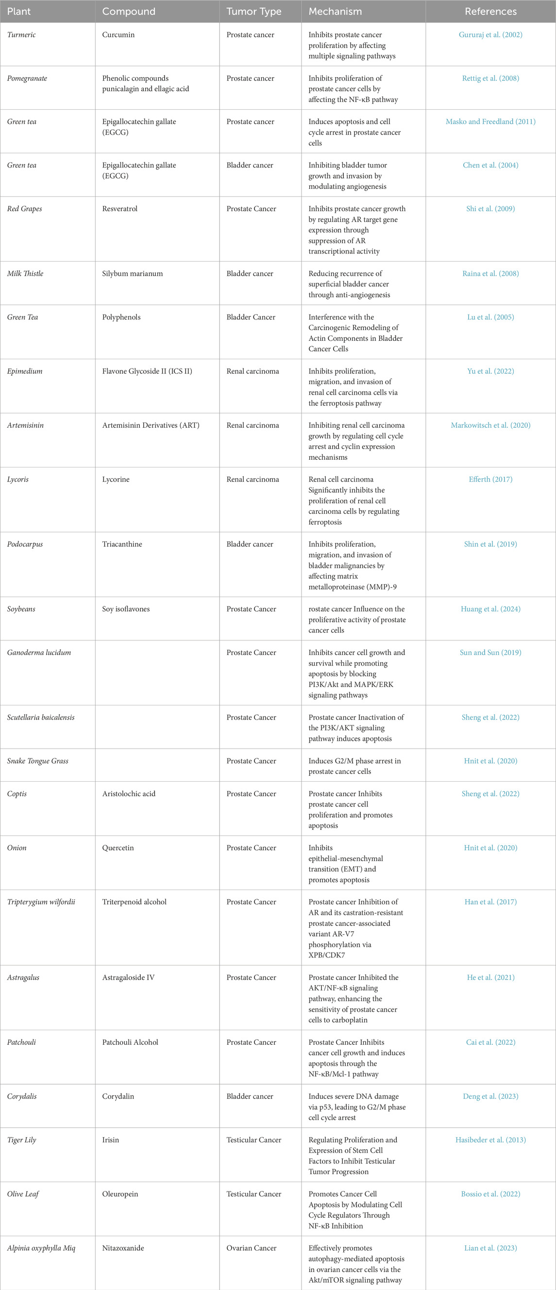 Economic and medical disparities in developing countries limit access to precision medicine (Yi et al., 2020), underscoring the need for more treatment options to reduce disease burden and improve quality of life. TCM, with its multi-target, multi-pathway, and low-toxicity profile, is widely accepted as an alternative cancer therapy. With a history spanning nearly 2000 years (Xiang et al., 2019), TCM is now integrated into China’s healthcare system. Numerous herbal formulas, extracts, and natural compounds have been found to inhibit genitourinary tumor development through various mechanisms (Wang X. et al., 2018). Besides suppressing growth, invasion, and metastasis, TCM can reverse drug resistance and synergize with conventional drugs. Ancient texts like Shennong Ben Cao Jing document many herbs with anti-tumor properties. Current research shows that combining TCM with immunotherapy enhances anti-tumor effects (Li J. et al., 2025). TCM contains bioactive compounds—such as alkaloids, polysaccharides, and flavonoids—that modulate immune function, affecting both innate and adaptive immunity (Table 1) (Xie et al., 2023).