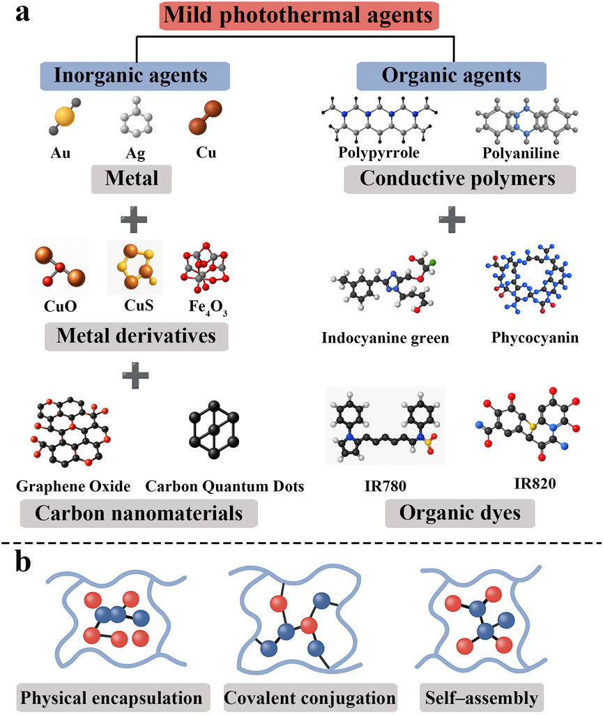 Mild photothermal hydrogels generate a controlled photothermal effect by incorporating functional materials with high photothermal conversion efficiency; thus, the choice of photothermal agent is crucial for system design. The main photothermal agents currently in use can be classified into inorganic and organic materials (Li W. et al., 2023) (Figure 1a). Common inorganic photothermal materials include metallic nanomaterials and carbon-based materials.