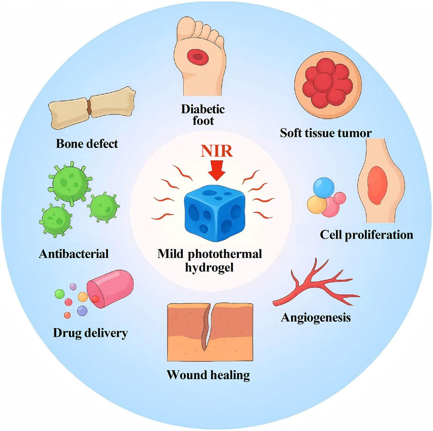 Bone and soft tissue injuries caused by trauma, burns, tumors, and sports-related incidents have become increasingly common, representing a major global public health challenge (Jin et al., 2024). Functional hydrogels, one of the most promising therapeutic strategies, have been successfully applied in various tissue repair contexts (Enayati et al., 2024). Among these, photothermal hydrogels have emerged as an innovative material that has attracted extensive research attention in recent years due to their unique biological advantages (Xiao et al., 2025; Zhang R. et al., 2025).