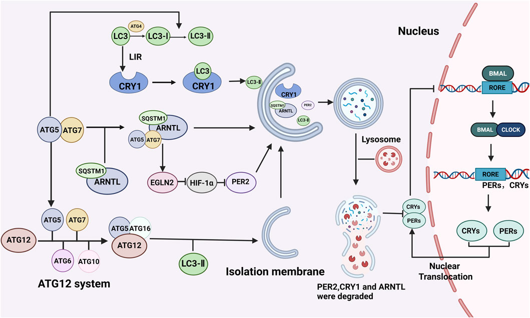 Figure 2. Regulation of the biological clock by autophagy. The regulatory effect of autophagy on the biological clock mainly involves the degradation of biological clock proteins. Autophagy-related proteins such as LC3 and ATG5 can bind to the corresponding receptors of the circadian clock proteins CRY1 and ARNTL, promote protein degradation, destroy the circadian clock molecular oscillator’s stable cycle, and regulate the circadian clock. BioRender.