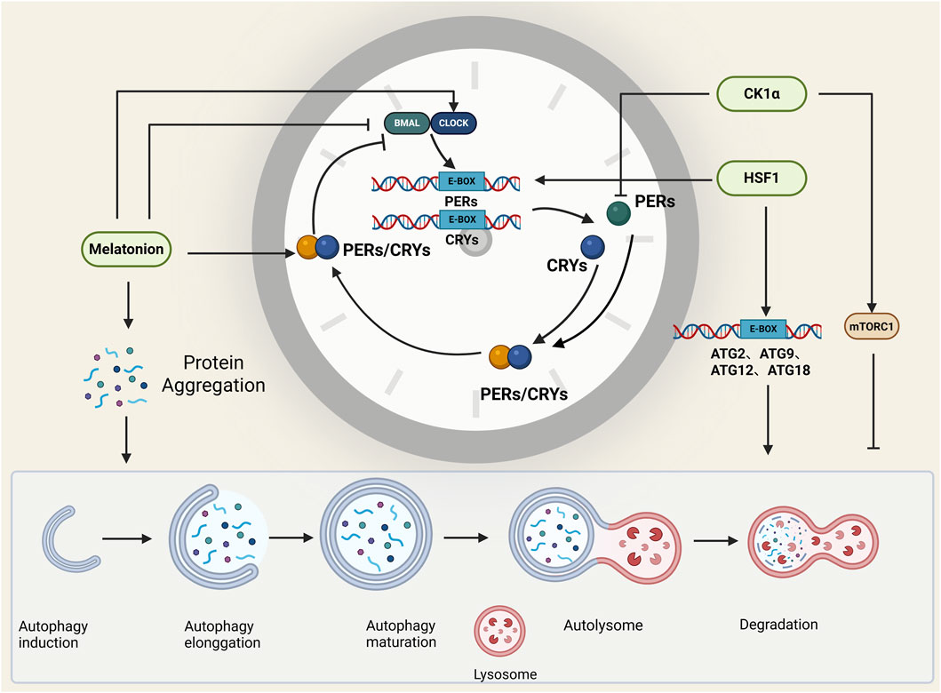 The circadian clock, present in photosensitive organisms, regulates biological rhythms synchronized with geophysical time (Panda, 2016). This clock comprises central and peripheral clocks: the central clock integrates internal and external signals, influencing the peripheral clock via hormonal and neural pathways that govern behaviour and temperature regulation in mammals (Dibner et al., 2010; Buhr et al., 2010; Brown et al., 2002). This 24-h rhythm relies on a transcriptional feedback loop involving core proteins such as BMAL1, CLOCK, PERIOD (PER1, PER2, PER3), and CRYPTOCHROME (CRY1, CRY2) (Kume et al., 1999; Gekakis et al., 1998; Shearman et al., 2000). BMAL1 binds to the CLOCK protein to form CLOCK: BMAL1 heterodimers (Partch et al., 2014), which bind to the promoters of the PER and CRY genes, promoting their transcription and forming PER: CRY heterodimers in the cytoplasm (Michael et al., 2023). PER: CRY heterodimers inhibit CLOCK: BMAL1 activity when critical concentrations are reached (Rabinovich-Nikitin et al., 2019). In addition, the nuclear receptor families REV-ERBα and REV-ERBβ, as well as the orphan nuclear receptor RORs, are involved in regulating the circadian clock (Bunney et al., 2015; Cho et al., 2012). The circadian clock orchestrates the rhythmic gene expression governing key cellular processes—including autophagy, metabolism, redox regulation, DNA repair, and cell cycle control—through molecular-level transcription-translation feedback loops (TTFLs) (Matsuo et al., 2003; Wende et al., 2016; Sancar et al., 2010). It plays a pivotal role in maintaining organismal homeostasis and in the pathogenesis of diseases, such as cancer. Importantly, the precise regulation of autophagy by the clock constitutes a critical mechanism for maintaining cellular homeostasis (Zhu et al., 2024; Patel and Kondratov, 2021).