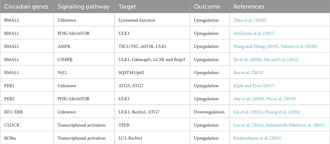 Several biological clock-related genes collaborate to maintain the stable oscillation of the molecular oscillator and the rhythmicity of autophagy, thereby ensuring the normal function of various organs in the body. Among these biological clock genes are BMAL1, PER, and REV-ERB, which play pivotal roles in regulating autophagy (Table 1; Figure 1).