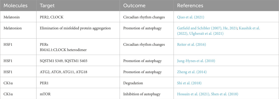 At present, a variety of molecules have been confirmed to simultaneously regulate the circadian clock and autophagy; these molecules play important roles in the connection between autophagy and the circadian clock, and the relevant molecules mainly include the following types (Table 2; Figure 3).