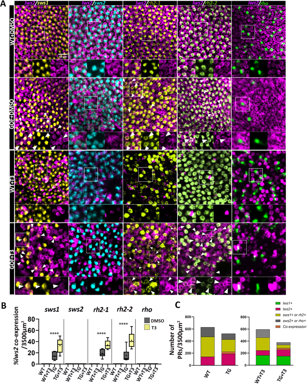 Figure 2. Trβ2 gain-of-function induces co-expression of lws2 in non-LWS cones. The proportion of photoreceptors co-labeled lws2 and a different opsin type per unit area also increases after thyroid hormone (T3) treatment. (A) Fluorescence in situ hybridization (HCR) of 4dpf fish showing lws2 co-expression with selected opsin transcripts (sws1, sws2, rh2-1, rh2-2, and rho). In wildtype fish, no co-expression with other opsin subtypes within individual cones was observed (WT + DMSO and WT + T3 rows). However, lws2 co-expression was observed in both transgenic groups with increased proportions in the transgenic group that received T3 treatment (GOF + T3). No clear co-labeling of sws2 (cyan) or rho (green) with lws2 was observed in either transgenic group. The arrowheads indicate cells that are co-labeled for both lws2 and another opsin subtype. Insets display enlarged regions with separate channels to highlight co-expression. (B) Box and whisker plot showing the percentage of cells that are positive for both lws2 and sws1 or rh2-1, rh2-2, rho per 3500 μm2 area dorsal to the optic nerve head. Statistical significance is represented as ****P < 0.0001. P-values were calculated using beta regression to compare co-expression proportions in transgenic DMSO and T3 groups. (C) Stacked bar graph of photoreceptor counts in WT and trβ2 GOF after DMSO/T3 treatment. Colors indicate opsin expression: lws1+ (green), lws2+ (magenta), sws1+ or rh2+ (yellow), sws2+ or rho+ (gray), and lws2/sws1+ or lws2/rh2+ co-expression (orange crosshatch). Scale bar = 10 μm.