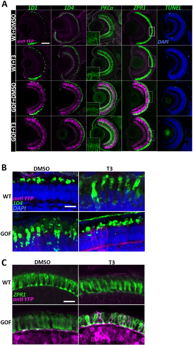 Figure 3. Trβ2 overexpression and T3 treatment alter cone morphology and/or distribution of selected cone antigens. (A) Confocal images of cryosectioned eyes from 6dpf wildtype and trβ2 GOF transgenic fish, immunolabeled for rod opsin (rho, 1D1), red opsin (1D4), bipolar cells (PKCα), and double cones (ZPR1). Insets in A show the PKCα channel only. Rectangular boxes in the ZPR1 column highlight regions magnified in C. (B) Higher magnification of images displaying 1D4 immunolabel, showing further changes in localization of Lws opsin(s). (C) Higher magnification of ZPR1 immunolabel in T3-treated trβ2 GOF transgenics, revealing changes in cone morphology and/or distribution of antigen. Scale bars in A = 50 μm, B and C = 5 μm.