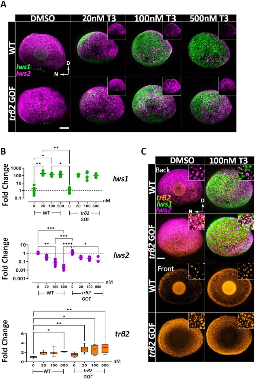 Because TH has been demonstrated to positively regulate its receptor(s) in other contexts (Laslo et al., 2019; Taylor et al., 2023), we evaluated transcript abundance of trβ2 by qPCR and by HCR fluorescence in situs (Figures 4B,C). Levels of trβ2 were indeed increased by T3 treatment in WT larvae, but only significantly (by approximately 2-fold) by the 500 nM treatment (Figure 4B). In the GOF transgenics, T3 treatment increased trβ2 transcripts significantly (compared to WT DMSO-treated) by approximately 3-fold at all concentrations (Figure 4B). The trβ2 transcript was co-expressed within all lws1+ and lws2+ cones in WT and trβ2 GOF, in both DMSO and 100 nM T3-treated conditions (Figure 4C).