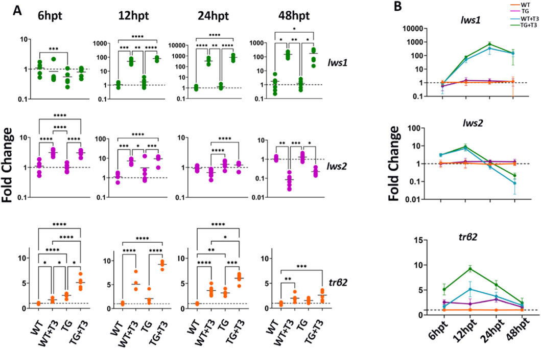 Figure 5. Trβ2 upregulation precedes lws1 activation and aligns with lws2 downregulation). (A) RT-qPCR analysis of wildtype and trβ2 GOF transgenic fish in a time-series experiment, treated with 100 nM T3, to assess the temporal dynamics of lws1, lws2, and trβ2 mRNA expression. (B) Line graph showing the kinetics of fold change in lws1, lws2, and trβ2 mRNA expression over time (hours post treatment, hpt). Scatter plots and line graphs represent fold changes in transcript expression (2^-ddCT). Each point in the scatter plot corresponds to a biological replicate (n ≥ 6). P-values were determined by comparing ddCT values across groups using Kruskal–Wallis one-way ANOVA with post hoc Dunn’s correction. Statistical significance is indicated as follows: *P < 0.05, **P < 0.01, ***P < 0.001, ****P < 0.0001. WT = wildtype; TG = transgenic overexpressing trβ2.
