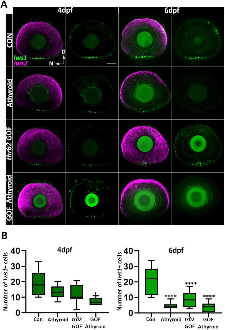 Results: we found evidence consistent with the hypothesis that unliganded TRβ2 predominantly promotes lws2 expression, while liganded TRβ2 upregulates lws1, following a dose-dependent and temporally dynamic pattern. Overexpression of TRβ2 promoted co-expression of lws2 in non-LWS cones, suggesting possible photoreceptor transfating. TH supplementation amplified these effects and induced changes in numbers and morphologies of cone subtypes with no obvious evidence of cell death. We also identified spatially distinct expression of key TH regulatory genes (dio2, dio3b, mct8) in the retina and retinal pigment epithelium, which responded dynamically to manipulation of TH levels.
