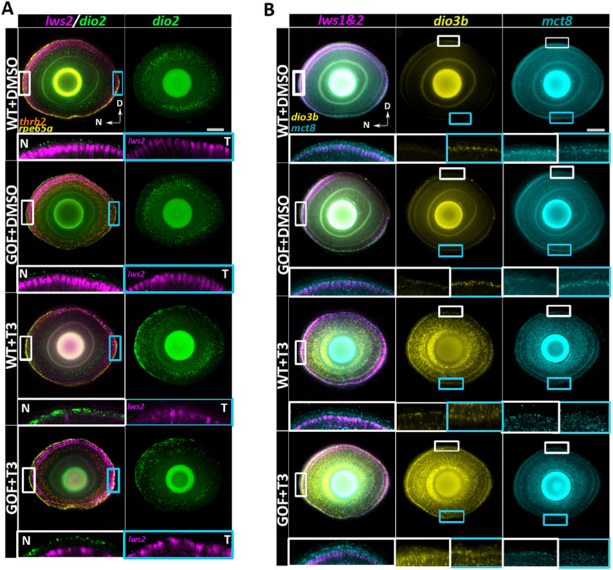 Figure 7. Confocal visualization of opsin and thyroid hormone-related gene expression in 4dpf wildtype and trβ2 GOF transgenic larval retinas treated with T3 or DMSO. (A) Single z-projection of lws2 expression overlaid with dio2, trβ2, and rpe65a labels. White rectangular boxes mark magnified areas in the N: Nasal region (left) and cyan rectangular boxes mark areas in the T: Temporal region (right), both rotated 90° (such that RPE is upper and photoreceptor layer is lower in the insets) and without trβ2 or rpe65a labels. N and T panels reveal the naso-temporal patterning of dio2 in the retinal pigment epithelium (RPE). The second column in A shows a full projection of the dio2 channel, highlighting its naso-temporal gradient in both the RPE and neural retina, where dio2 expression decreases from nasal to temporal regions. (B) Single z-projection of lws (labeling both lws1 and lws2) expression overlaid with dio3b and mct8. Smaller white boxes within the lws1&2 column show regions magnified and rotated 90° within the same column (such that nasal is upper, and temporal is lower in the insets). Mct8 expression extends beyond the neural retina into the RPE, with increased expression in T3-treated groups. Larger white and cyan insets in dio3b and mct8 columns magnify areas highlighted by smaller boxes, showing dio3b dorso-ventral patterning in the photoreceptor cell layer and mct8 upregulation in response to T3 treatment. Scale bar = 50 μm.
