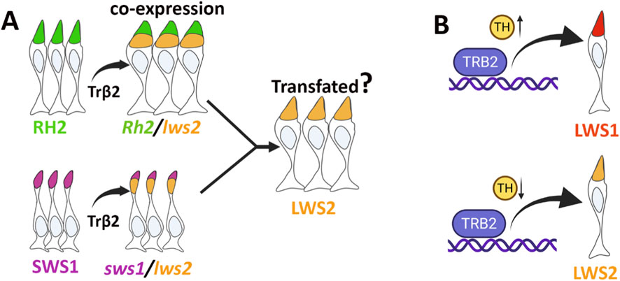 Figure 8. Schematic illustration of proposed Trβ2-mediated photoreceptor transfating and ligand-dependent regulation. (A) Trβ2 promotes lws2 expression in RH2 and SWS1 cones, potentially leading to their transfating into LWS2 photoreceptors. (B) In the absence of ligand (unliganded Trβ2) or reduced ligand, lws2 expression is predominantly enhanced. In contrast, ligand-bound Trβ2 (liganded Trβ2) preferentially upregulates lws1 expression. Figure created with BioRender.com.