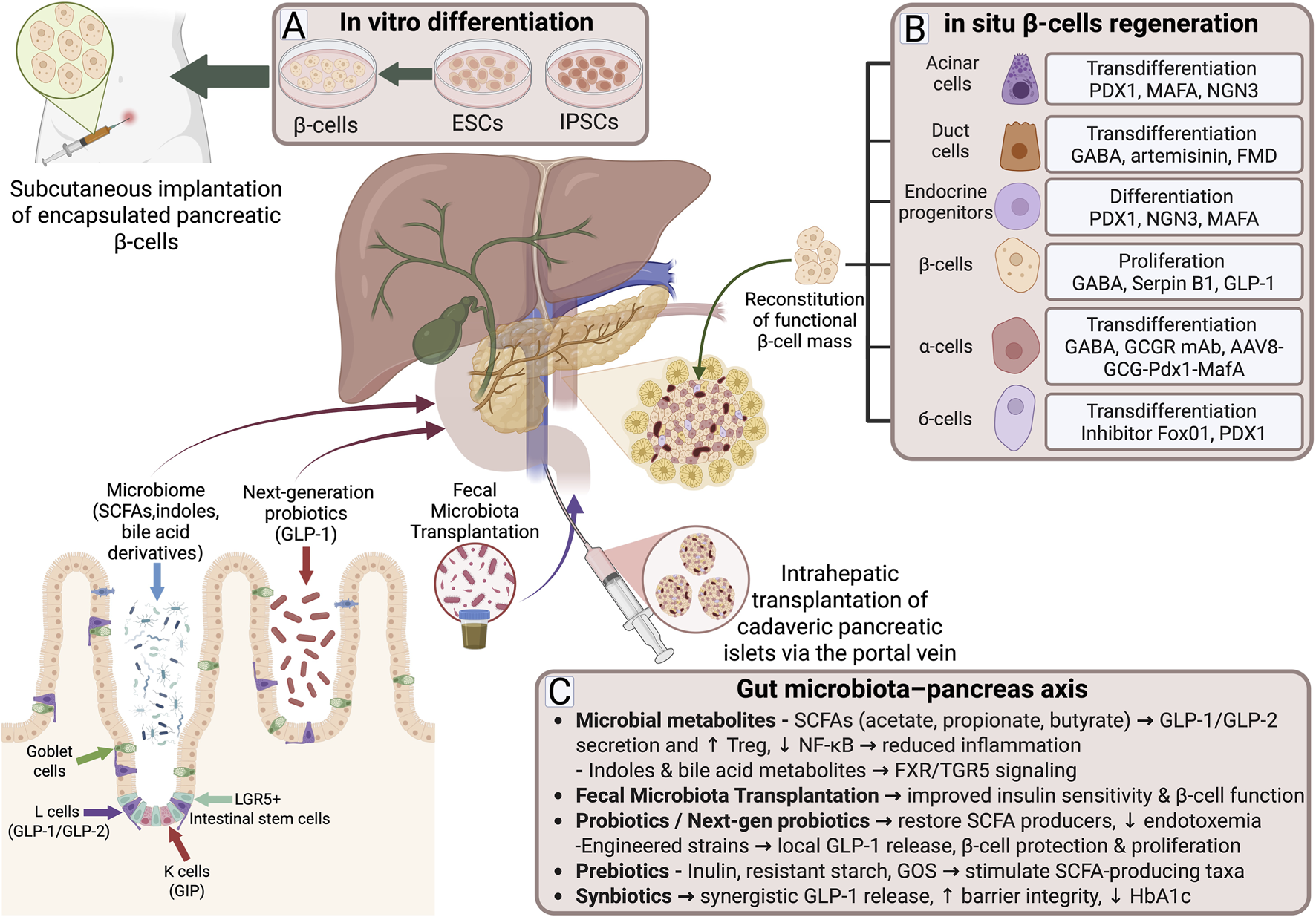 Figure 1. Overview of current strategies for pancreatic β-cell regeneration and modulation in type 2 diabetes. (A) In vitro approaches include the differentiation of human stem cells into insulin-producing β-cells, with subsequent subcutaneous implantation of encapsulated cells as a potential therapeutic strategy. Intrahepatic transplantation of cadaveric islets via the portal vein also represents a clinically applied regenerative approach. (B) In situ regeneration encompasses transdifferentiation of acinar and ductal cells, differentiation of endocrine progenitors, stimulation of β-cell proliferation, and reprogramming of α- and δ-cells, collectively contributing to the reconstitution of functional β-cell mass. (C) The gut microbiota-pancreas axis represents an additional layer of regulation, where microbial metabolites such SCFAs, indoles, and bile acid derivatives enhance incretin secretion, improve insulin sensitivity, and reduce inflammation. Interventions including prebiotcs, synbiotics fecal microbiota transplantation, and next-generation probiotics offer translational opportunities to modulate host metabolism and β-cell function.
