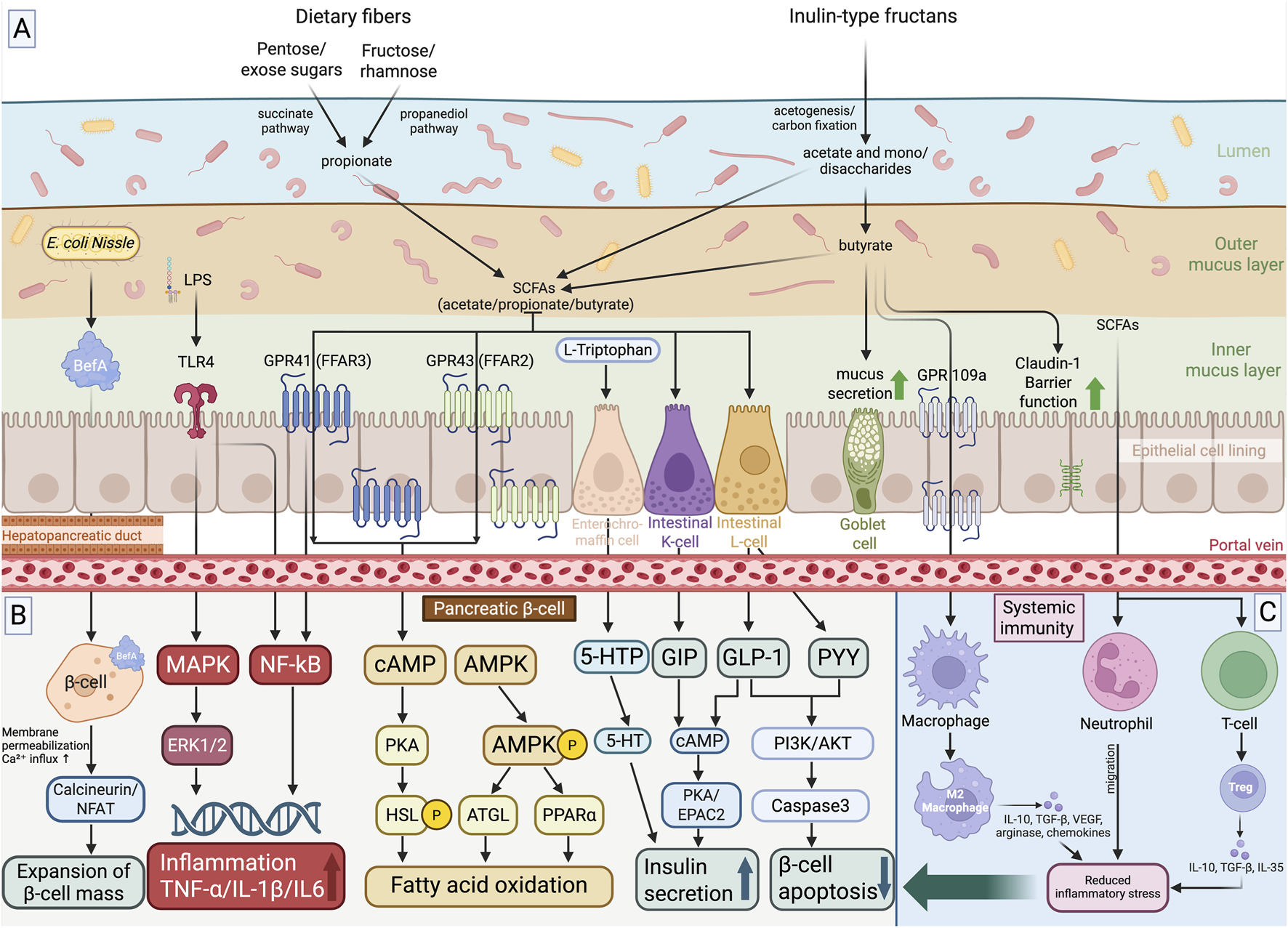 Figure 2. Overview of Gut Microbiota–Derived Metabolite Signaling Toward the Pancreatic β-Cell. (A) Dietary substrates: pentoses, hexoses and inulin-type fructans are fermented by the gut microbiota to produce short-chain fatty acids (SCFAs) via the succinate and propanediol pathways; butyrate is additionally generated during the degradation of inulin-like fructans. (B) The bacterial protein BefA in β-cells increases membrane permeability to Ca2+ and activates the calcineurin/NFAT pathway, thereby enhancing β-cell neogenesis and proliferation, whereas LPS from Gram-negative bacteria signals via TLR4 to trigger MAPK/ERK1/2- and NF-κB-dependent inflammatory cascades. Microbial tryptophan metabolites stimulate enterochromaffin, K- and L-cells, increasing the production of 5-HTP/5-HT, GIP and GLP-1, which reach the pancreas through the portal circulation, activate GIPR and GLP1R on β-cells, raise intracellular cAMP and engage PKA- and EPAC2-dependent cascades, thereby potentiating insulin granule exocytosis and glucose responsiveness; GLP-1 additionally activates PI3K/AKT signaling and reduces caspase-3–mediated apoptosis. Butyrate, acting via GPR109A on goblet cells, stimulates mucus secretion and claudin-1 expression, thereby strengthening the epithelial barrier. (C) SCFAs and other microbial metabolites polarize macrophages toward an M2-like phenotype and support Treg differentiation, accompanied by increased secretion of IL-10 and TGF-β, reduced systemic inflammation, and indirect protection of β-cells. Created in BioRender. Ruchko, E. (2025) https://BioRender.com/3soms7k.