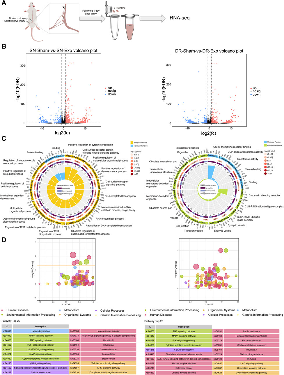 Figure 1. Transcriptomic profiling of rat DRGs following sciatic nerve injury and dorsal root injury. (A) Diagrammatic representation of RNA sequencing of rat DRGs after sciatic nerve injury (SN-Exp), dorsal root injury (DR-Exp), or corresponding sham surgery (SN-sham/DR-sham). (B) Number of differentially expressed mRNAs in DRGs after sciatic nerve injury or dorsal root injury as compared to the respective sham surgery. (C) Enriched GO terms in DRGs after sciatic nerve injury or dorsal root injury. (D) Enriched KEGG pathways in DRGs after sciatic nerve injury or dorsal root injury.