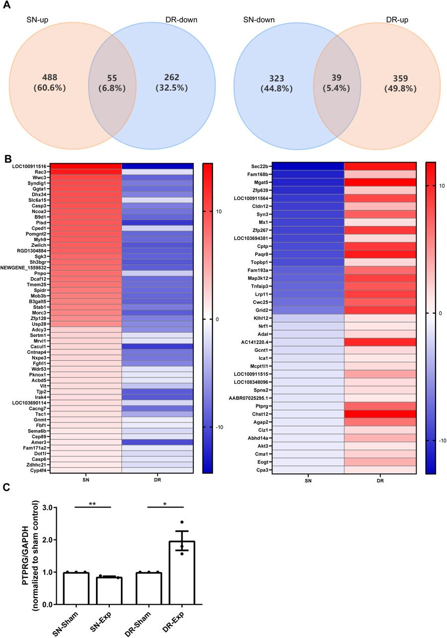 Figure 2. Identification of mRNAs with inverse expression patterns in rat DRGs following sciatic nerve injury and dorsal root injury. (A) Venn diagram of the overlapping differentially expressed mRNAs. (B) Heatmap visualization of bidirectionally regulated genes. (C) qRT-PCR examination of the relative mRNA expression level of PTPRG in rat DRGs after sciatic nerve injury and dorsal root injury. Unpaired t-test; n = 3 biological independent experiments; *, p-value < 0.05; **, p-value < 0.01.