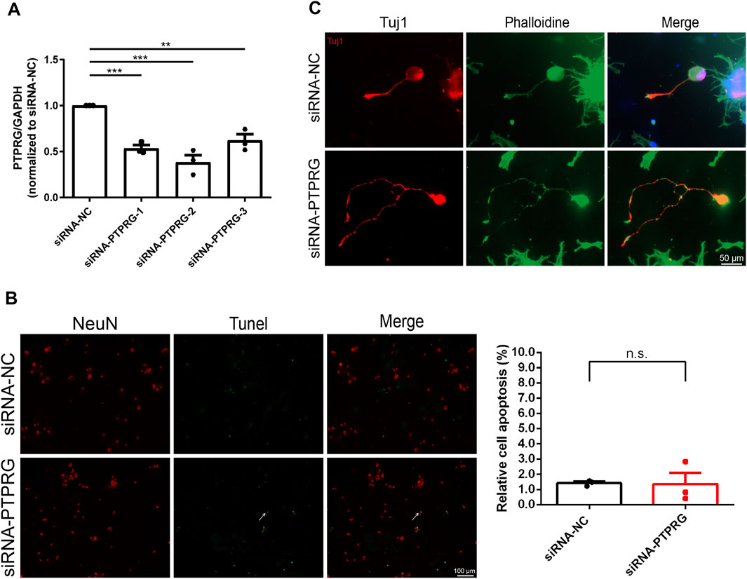Figure 3. Reduced PTPRG in DRG neurons enhances neurite outgrowth without affecting neuronal survival. (A) qRT-PCR examination of the relative mRNA expression level of PTPRG in cultured DRG neurons. Ordinary one-way ANOVA followed by Dunnett’s multiple comparisons test; n = 3 biological independent experiments; **, p-value < 0.01; ***, p-value < 0.001. (B) TUNEL staining images of DRG neurons transfected with control siRNA (siRNA-NC) or siRNA targeting PTPRG (siRNA-PTPRG) and quantitative analyses of neuronal apoptosis. Red color indicates NeuN staining and green color indicates TUNEL staining. Arrow indicates representative TUNEL-positive neuron. Scale bar, 100 μm. Unpaired t-test; n = 3 biological independent experiments. (C) Tuj1 and phalloidin staining images of DRG neurons transfected with control siRNA or siRNA targeting PTPRG. Red color indicates Tuj1 staining and green color indicates phalloidin staining. Scale bar, 50 μm.