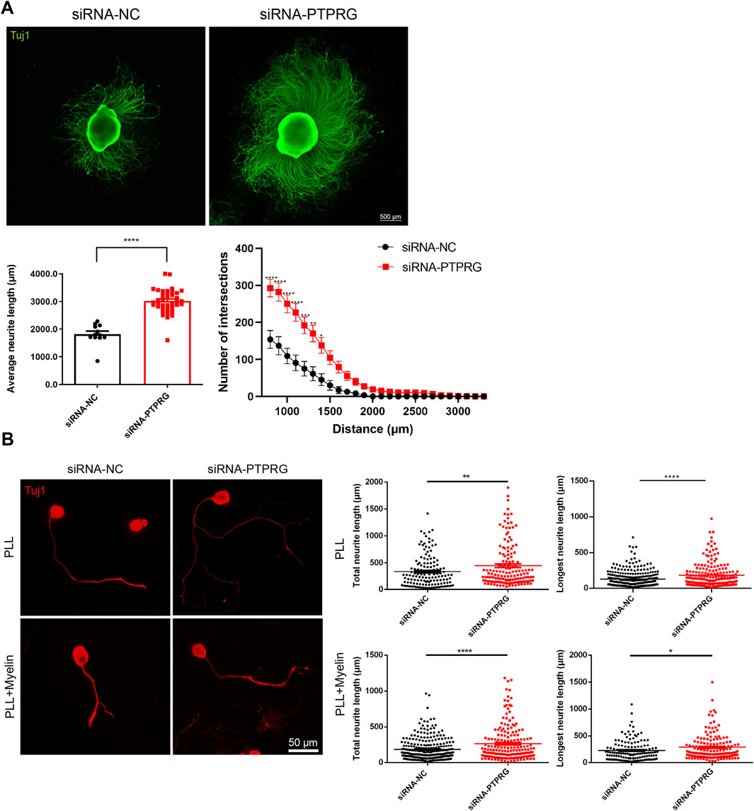 Figure 4. Reduced PTPRG promotes neurite growth and extension. (A) Tuj1 staining images of DRG explants transfected with control siRNA or siRNA targeting PTPRG, and quantitative analysis of neurite extension. Scale bar, 500 μm. (Left) The average maximum outgrowth distance measured from the explant edge to the axon tip in four directions per explant. Unpaired t-test; n > 10 DRG explants; ****, p-value < 0.0001. (Right) The length of neurite extension at varying distances from the explant body. Two-way ANOVA following by Du’s multiple comparisons test; n > 10 DRG explants; *, p-value < 0.05; **, p-value < 0.01; ***, p-value < 0.001, ****, p-value < 0.0001. (B) Tuj1 staining images of DRG neurons cultured on glass coverslips pre-coated with PLL or PLL plus myelin and quantitative analyses of neurites. Scale bar, 50 μm. Unpaired t-test; n > 130 neurons for neurons cultured on PLL and n > 180 neurons for neurons cultured on PLL plus myelin; *, p-value < 0.05; **, p-value < 0.01; ****, p-value < 0.0001.