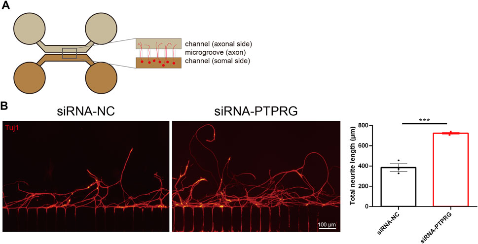 Figure 5. Reduced PTPRG promotes axonal regeneration. (A) Schematic diagram of the experimental model for analyzing axonal regeneration following in vitro axotomy using a microfluidic device. (B) Tuj1 staining images of regenerated axons of DRG neurons transfected with control siRNA or siRNA targeting PTPRG and quantitative analysis of regenerated axon length. Scale bar, 100 μm. Unpaired t-test; n = 3 biological independent experiments; ***, p-value < 0.001.