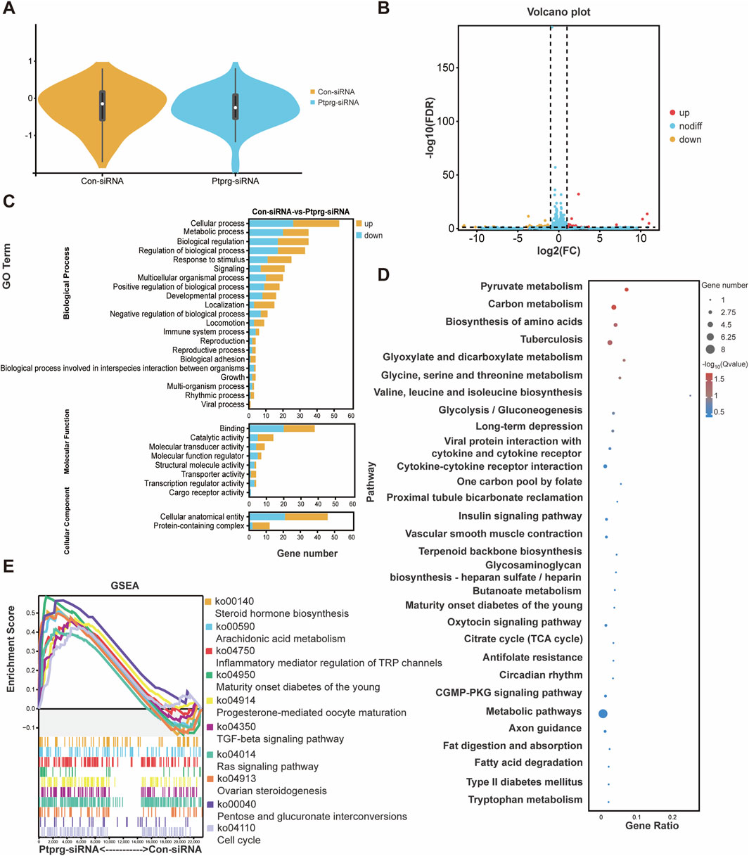 To explore the potential mechanisms associated with PTPRG silencing, we performed sequencing analysis. Using violin plots to visualize gene expression from sequencing results, we found that neurons transfected with control siRNA and those transfected with PTPRG siRNA exhibited comparable levels of gene expression (Figure 6A). We identified a total of 83 differentially expressed mRNAs, comprising 42 upregulated and 41 downregulated mRNAs (Figure 6B). Top enriched GO biological process terms with more than 30 annotated differentially expressed genes were GO biological process terms cellular process, metabolic process, biological regulation, and regulation of biological process, GO molecular function term binding, as well as GO cellular component term cellular anatomical entity (Figure 6C). Many metabolism-related pathways were identified to be top enriched KEGG pathways, including pyruvate metabolism, carbon metabolism, biosynthesis of amino acids, glyoxylate and dicarboxylate metabolism, glycine, serine and threonine metabolism, valine, leucine and isoleucine biosynthesis, and glycolysis/gluconeogenesis, one carbon pool by folate, terpenoid backbone biosynthesis, glycosaminoglycan biosynthesis-heparan sulfate/heparin, butanoate metabolism, citrate cycle (TCA cycle), metabolic pathways, fatty acid degradation, and tryptophan metabolism (Figure 6D). In addition to analyzing significant changes in individual genes, we also explored the coordinated changes across gene sets using GSEA and directly visualized expression trends genome-wide. Consistent with the enriched metabolic processes in differentially expressed genes, many enriched GSEA pathways with high normalized enrichment score (NES) values were associated with biosynthesis and metabolism, such as steroid hormone biosynthesis, arachidonic acid metabolism, and maturity onset diabetes of the young (Figure 6E).