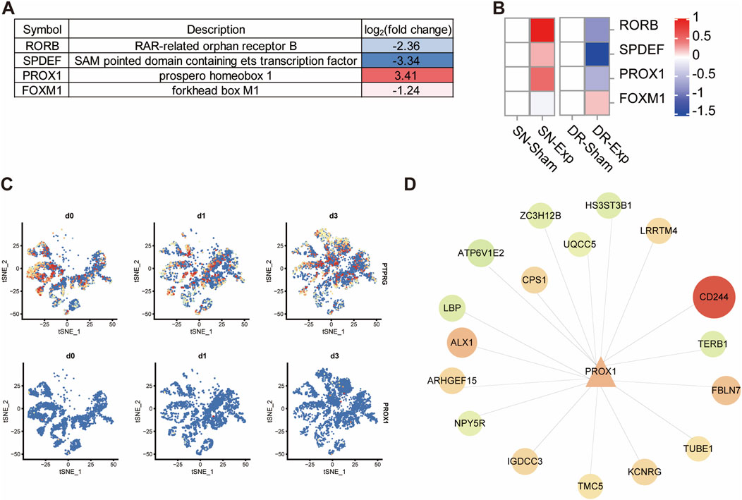 Figure 7. Reduced PTPRG increases the expression of transcription factor coding gene PROX1. (A) List of differentially expressed transcription factor coding genes in DRG neurons transfected with control siRNA or siRNA targeting PTPRG. (B) Expressions of SPDEF, PROX1, RORB, and FOXM1 in rat DRGs after sciatic nerve injury, dorsal root injury, or corresponding sham surgery. (C) tSNE distribution of PTPRG and PROX1 in mouse DRG neurons at 0, 1, and 3 days after sciatic nerve injury. (D) Genetic network of PROX1 and its downstream target genes. Upregulated genes in DRG neurons transfected with siRNA targeting PTPRG were labelled with red color while downregulated genes were labelled with green color.