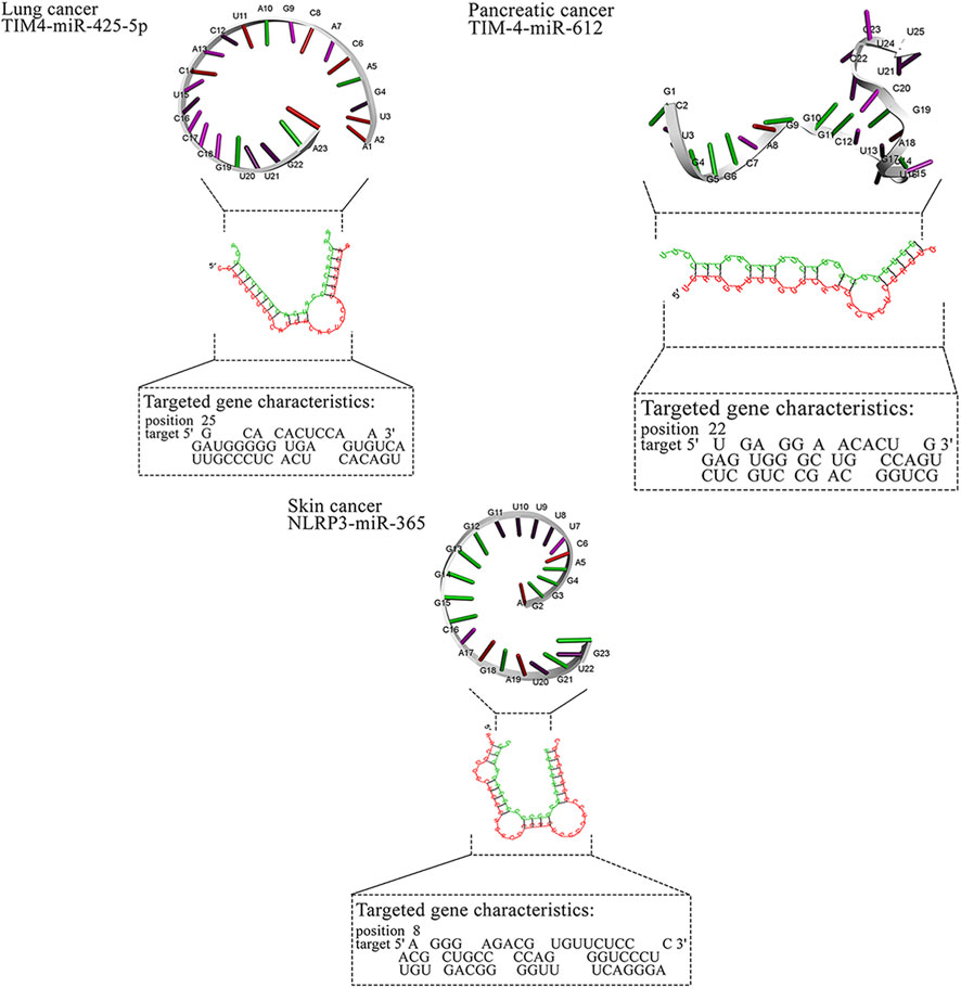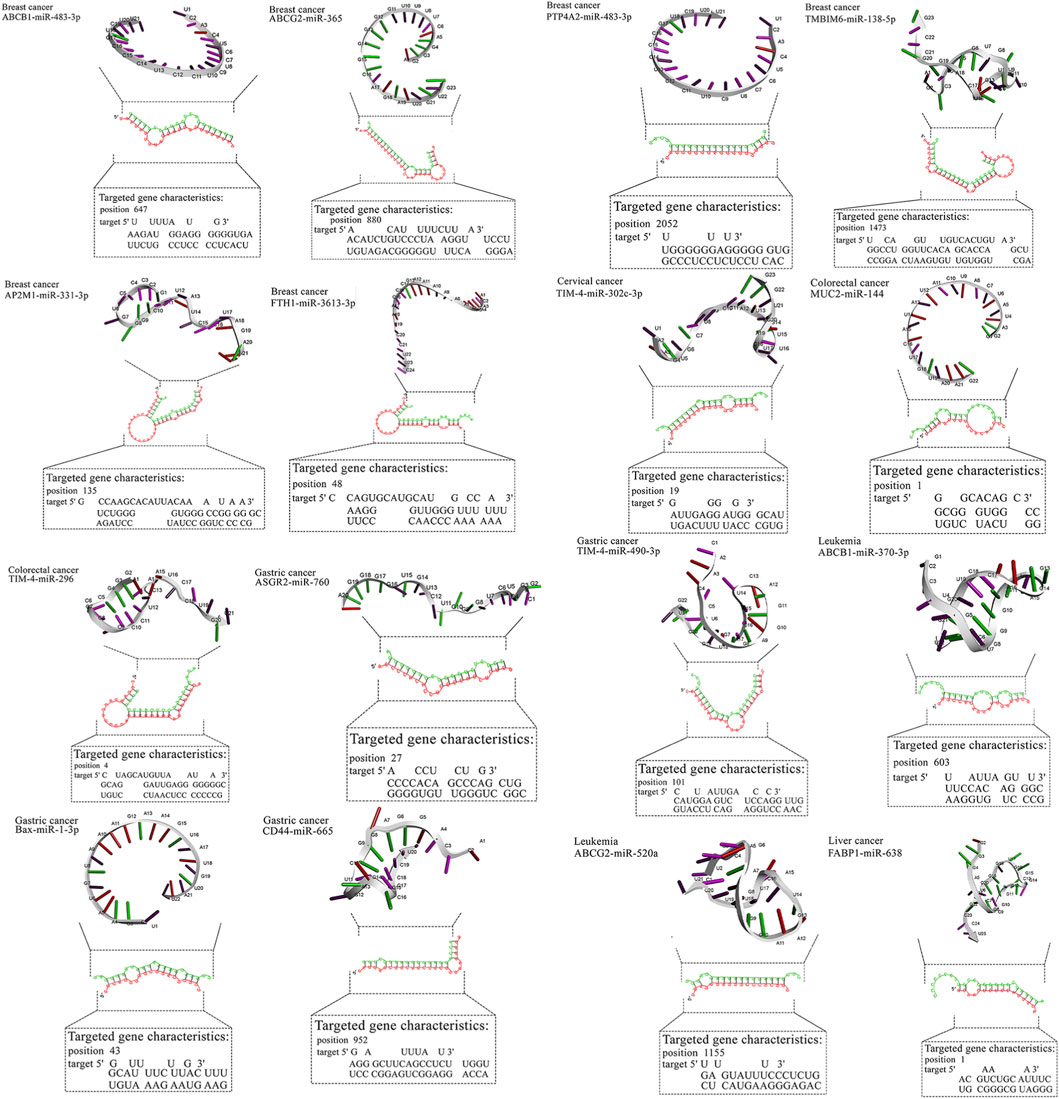 Figure 2. Detailed data about molecular interactions between microRNAs with anti-cancer activity and genes affected by MPs. The 3D structure at the top of the figure represents microRNA with the highest binding affinity toward the gene affected by MPs. The data about the targeted gene is depicted in the lower part of the figure. ABCB1, ATP Binding Cassette Subfamily B Member 1; ABCG2, ATP Binding Cassette Subfamily G Member 2; AP2M1, Adaptor Related Protein Complex 2 Subunit Mu 1; ASGR2, Asialoglycoprotein Receptor 2; Bax, BCL2 Associated X, Apoptosis Regulator; BCL2, B-cell CLL/lymphoma 2; BRAF, B-Raf Proto-Oncogene, Serine/Threonine Kinase; c-jun, Jun Proto-Oncogene, AP-1 Transcription Factor Subunit; CD44, CD44 Molecule (Indian Blood Group); ERK, Extracellular Signal-Regulated Kinase; FABP1, Fatty Acid Binding Protein 1; FTH1, Ferritin Heavy Chain 1; HO-1, Heme Oxygenase 1; JNK, c-Jun N-terminal Kinase; KRAS, KRAS Proto-Oncogene, GTPase; LXR-α, Liver X Receptor Alpha; MAP2K1, Mitogen-Activated Protein Kinase Kinase 1; MAP2K4, Mitogen-Activated Protein Kinase Kinase 4; MAPK14, Mitogen-Activated Protein Kinase 14; MUC2, Mucin 2; NLRP3, NLR Family Pyrin Domain Containing 3; NLRP3, NLR Family Pyrin Domain Containing 3; PPARα, Peroxisome Proliferator-Activated Receptor Alpha; PPARγ, Peroxisome Proliferator-Activated Receptor Gamma; PTP4A2, Protein Tyrosine Phosphatase Type IVA, Member 2; TMBIM6, Transmembrane BAX Inhibitor Motif Containing 6; TIM4, T-cell Immunoglobulin and Mucin-domain Containing-4; TIM4, T-cell Immunoglobulin and Mucin-domain Containing-4; TIM4, T-cell Immunoglobulin and Mucin-domain Containing-4; TIM4, T-cell Immunoglobulin and Mucin-domain Containing-4; TIM4, T-cell Immunoglobulin and Mucin-domain Containing-4.