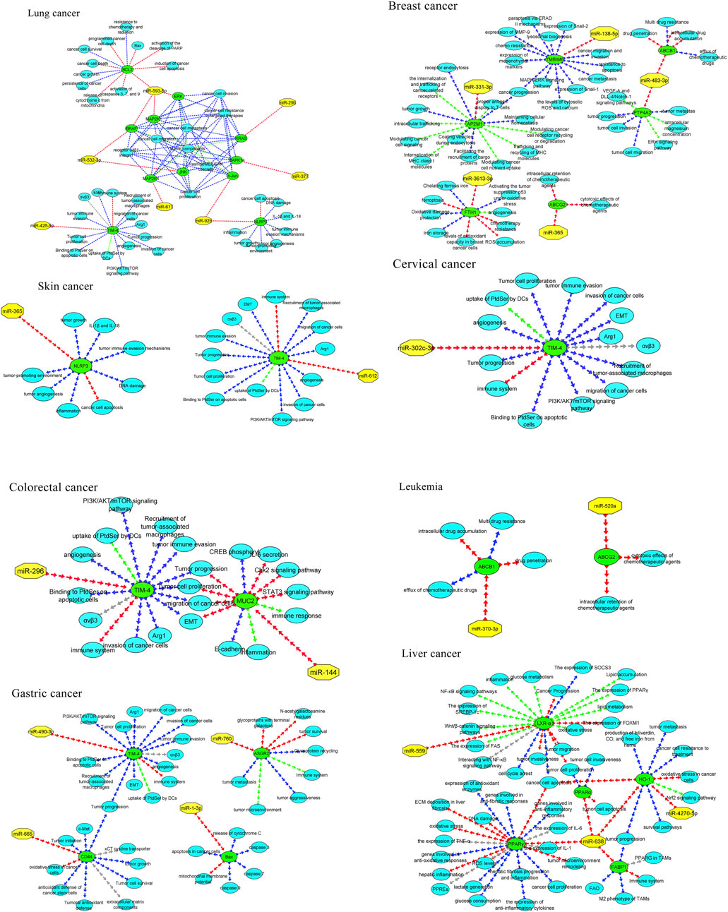 Figure 4. MicroRNAs with the in silico capability to suppress genes in MPs-based cancers and their possible targeted molecular pathways. The blue, red, green, and gray arrows represent activation (or upregulation), inhibition (or downregulation), regulation, and interaction, respectively. Moreover, yellow hexagons, blue ovals, and green ovals demonstrate microRNAs, targeted genes, and pathways affected by targeted genes, respectively. ABCB1, ATP Binding Cassette Subfamily B Member 1; ABCG2, ATP Binding Cassette Subfamily G Member 2; AP2M1, Adaptor Related Protein Complex 2 Subunit Mu 1; ASGR2, Asialoglycoprotein Receptor 2; Bax, BCL2 Associated X, Apoptosis Regulator; BCL2, B-cell CLL/lymphoma 2; BRAF, B-Raf Proto-Oncogene, Serine/Threonine Kinase; c-jun, Jun Proto-Oncogene, AP-1 Transcription Factor Subunit; CD44, CD44 Molecule (Indian Blood Group); ERK, Extracellular Signal-Regulated Kinase; FABP1, Fatty Acid Binding Protein 1; FTH1, Ferritin Heavy Chain 1; HO-1, Heme Oxygenase 1; JNK, c-Jun N-terminal Kinase; KRAS, KRAS Proto-Oncogene, GTPase; LXR-α, Liver X Receptor Alpha; MAP2K1, Mitogen-Activated Protein Kinase Kinase 1; MAP2K4, Mitogen-Activated Protein Kinase Kinase 4; MAPK14, Mitogen-Activated Protein Kinase 14; MUC2, Mucin 2; NLRP3, NLR Family Pyrin Domain Containing 3; NLRP3, NLR Family Pyrin Domain Containing 3; PPARα, Peroxisome Proliferator-Activated Receptor Alpha; PPARγ, Peroxisome Proliferator-Activated Receptor Gamma; PTP4A2, Protein Tyrosine Phosphatase Type IVA, Member 2; TMBIM6, Transmembrane BAX Inhibitor Motif Containing 6; TIM4, T-cell Immunoglobulin and Mucin-domain Containing-4; TIM4, T-cell Immunoglobulin and Mucin-domain Containing-4; TIM4, T-cell Immunoglobulin and Mucin-domain Containing-4; TIM4, T-cell Immunoglobulin and Mucin-domain Containing-4; TIM4, T-cell Immunoglobulin and Mucin-domain Containing-4.
