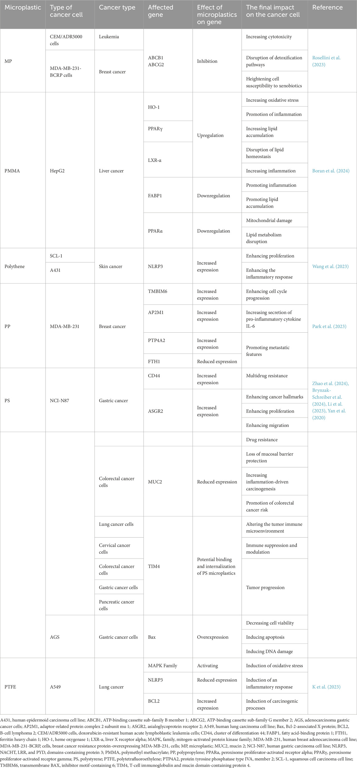 Besides, MPs affect some genes in cancer cells and suppress their effects. For instance, Polymethyl methacrylate (PMMA) inhibits liver cancer cells by downregulating FABP1 and PPAR alpha. According to prior surveys, MPs can downregulate specific genes in tumor cells, such as BCAS3, PHF19, and PRKCD, whose expression has been suppressed by microplastics in previous studies (Chen et al., 2025).