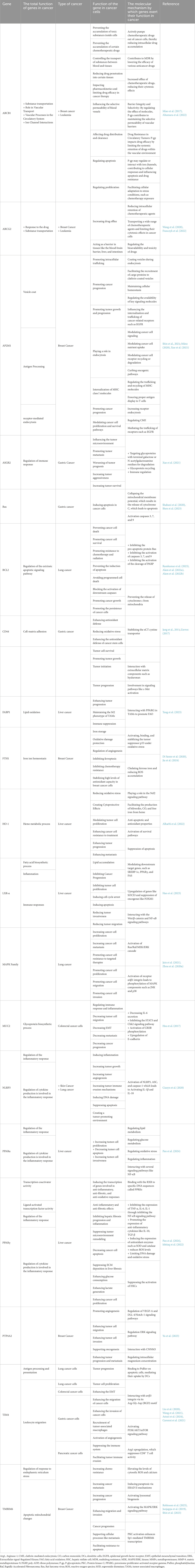 Table 2 maps each gene to cancer functions and mechanisms. Notable axes include: (i) drug efflux (ABCB1/ABCG2) → reduced intracellular drug levels; (ii) endocytosis/trafficking (AP2M1) → receptor signaling and nutrient uptake; (iii) immune modulation (TIM4) → efferocytosis and immune tolerance; (iv) metabolism/oxidative balance (PPARs, LXR-α, FABP1, HO-1) → growth and stress adaptation; (v) MAPK signaling → proliferation/migration; and (vi) cell death control (BAX↑, BCL2↑) → apoptosis set-point shifts. These roles provide mechanistic context for potential miRNA interventions (Table 2).