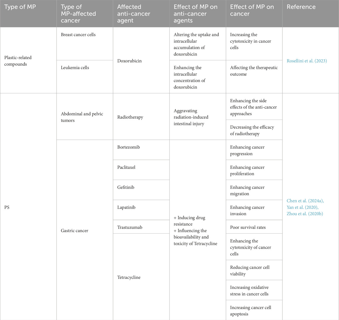 Table 3. Various effects of MPs on the anti-cancer agents and the final effect caused by these impacts on cancer cells.