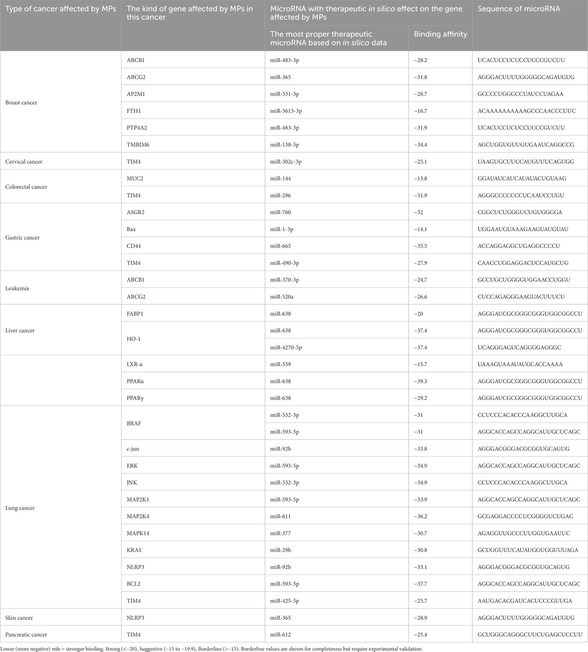 Table 4. Detailed information about the binding affinity of microRNAs and genes in cancer affected by MPs.