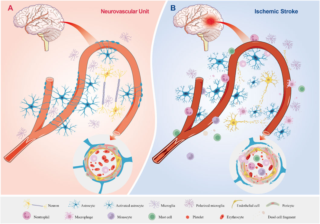 Figure 1. The Physiological State of the Neurovascular Unit and Its Pathological Changes in Ischemic Stroke. (A) The Neurovascular Unit Under Physiological Conditions. Astrocytes, neurons, and microglia display normal morphology and function. Astrocytes ensheath blood vessels, forming an integral component of the BBB, while establishing structural and functional connections with neurons and vascular elements. Astrocytic endfeet closely appose and encase blood vessels, and endothelial cells along with pericytes maintain well-organized morphology and normal physiological functions, supporting stable cerebral blood flow. (B) The Neurovascular Unit During Ischemic Stroke. Astrocytes, neurons, and microglia sustain damage or undergo cell death. Neuronal axons degenerate, microglia become polarized, and astrocytes become activated with enhanced proliferation. The BBB is disrupted, enabling the migration of circulating immune cells into the brain parenchyma, which results in inflammatory infiltration. Astrocytic endfeet are impaired and lose their tight association with blood vessels; endothelial cells and pericytes are damaged, leading to the breakdown of tight junctions and disorganized extracellular matrix deposition. Inflammatory cells accumulate and extravasate from blood vessels, while cerebral blood flow is significantly reduced or completely halted.