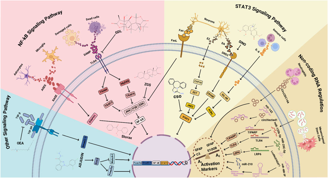 An extract from Alpinia oxyphylla Miq [Yi Zhi Ren (YZR)] significantly suppresses JNK activation and inhibits the ASK1/JNK/NF-κB pathway, leading to reduced astrocyte activation and inflammatory cytokine expression. This downregulation of inflammatory signaling helps limit cerebral infarction and preserve neurological function (Cheng et al., 2021). Storax exerts protective effects by inhibiting NF-κB activation, thereby reducing astrocyte reactivity, neuroinflammation, and cytotoxicity (Zhou et al., 2021). The aqueous extract of Ruta graveolens effectively attenuates inflammatory activation of astrocytes in the cortex and striatum, increases BDNF expression, reduces brain injury, improves neurological function, and suppresses inflammation (Campanile et al., 2022). Ginkgo biloba extract (EGB) inhibits LCN2 overexpression and the JAK2/STAT3 pathway in astrocytes, thereby suppressing astrocyte activation and the release of inflammatory factors, which in turn reduces infarct size and neuronal damage (Zhang et al., 2018). Ginkgolide (GDL) treatment inhibits astrocyte activation and the expression of IL-1β and TNF-α, enhances cell viability, and reduces peri-scar astrocyte reactivity, creating favorable conditions for post-stroke recovery (Li X. et al., 2020). Cottonseed oil (CSO) inhibits TLR4-mediated microglial activation and TNF-α secretion, thereby suppressing NF-κB-driven astrocyte activation. It reduces the release of inflammatory cytokines and promotes a protective astrocyte phenotype, ultimately alleviating IS-induced neuronal injury (Liu et al., 2020).